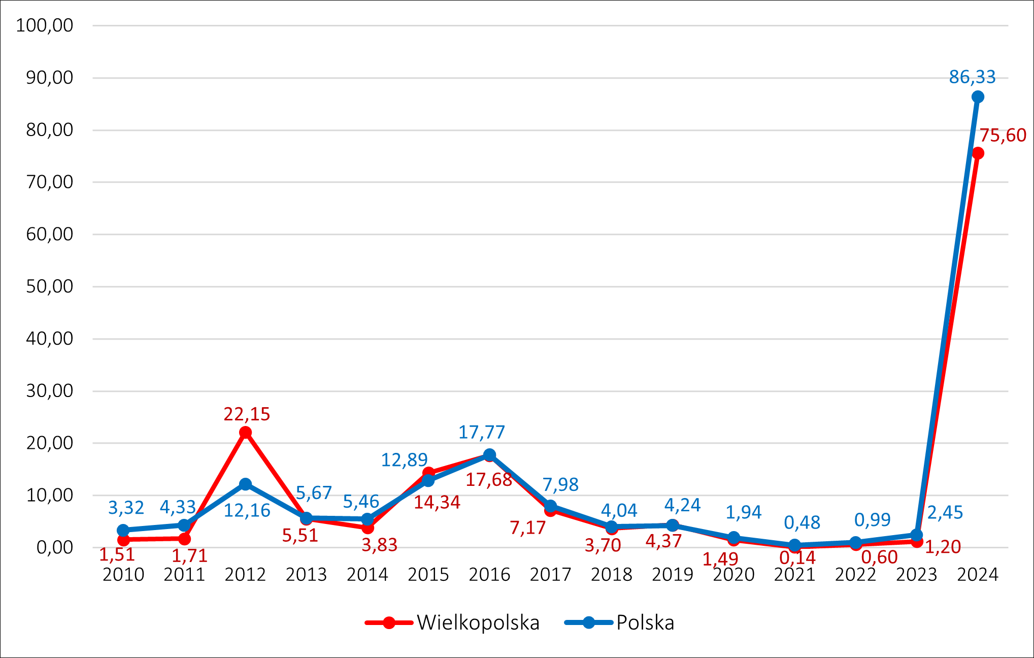 Zapadalność na krztusiec w Polsce i Wielkopolsce w latach 2010-2024