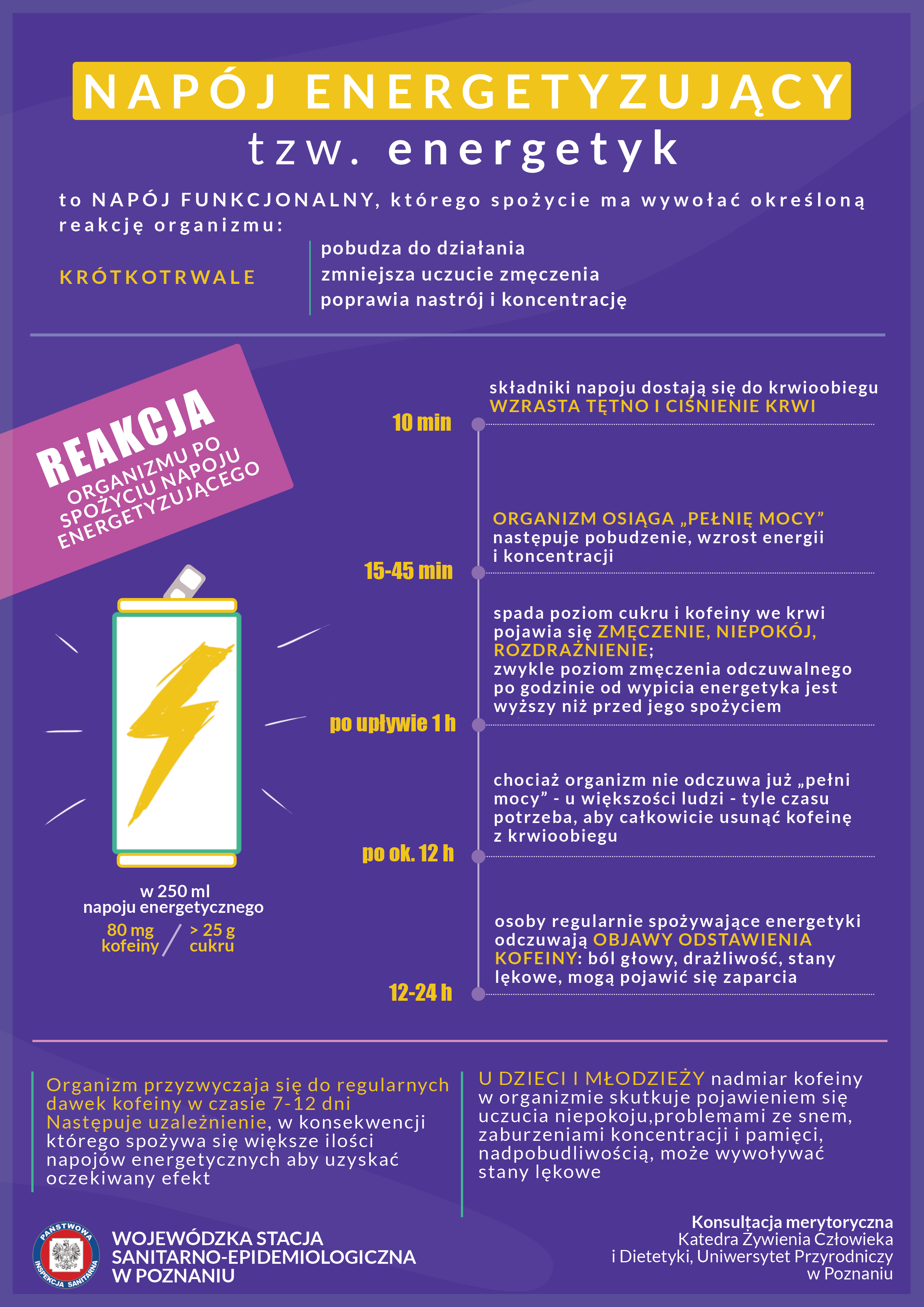 Chcesz dowiedzieć się więcej na temat napojów energetyzujących, zapoznaj się z infografikami opracowanymi przez pracowników Wojewódzkiej Stacji Sanitarno-Epidemiologicznej w Poznaniu. Pod względem merytorycznym uzyskały pozytywną opinię pracowników Katedry Żywienia Człowieka i Dietetyki Uniwersytetu Przyrodniczego w Poznaniu.