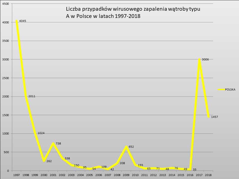 W 2018 r. odnotowano 22 przypadki zachorowań (o 90 mniej niż w roku 2017). Nadal znaczącą ilość zachorowań można jednak zaobserwować w Polsce – w 2018 r. odnotowano 1457 przypadków wirusowego zapalenia wątroby typu A (o 1549 mniej niż w 2017 roku).