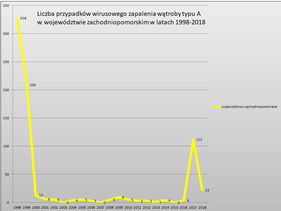 W 2017 roku zarówno w Polsce, jak i w woj. zachodniopomorskim odnotowano znaczący wzrost zachorowań na wirusowe zapalenie wątroby typu A. W toku prowadzonego dochodzenia epidemiologicznego ustalona została seksualna droga transmisji zakażeń wśród mężczyzn mających seks z mężczyznami, a także wtórne zakażenia drogą pokarmową. Część chorych podała w wywiadach epidemiologicznych informację dot. spożywania m. in. surowych, niemytych warzyw i owoców, a także spożywania posiłków w lokalach gastronomicznych, które były wskazywane przez inne osoby chore jako miejsca pracy lub spożywania posiłków. Ponadto część chorych podawała kontakty z osobami chorymi z województwa wielkopolskiego, gdzie również odnotowano wzrost zachorowań w 2017 r. Żaden z pacjentów nie był wcześniej szczepiony przeciwko wirusowemu zapaleniu wątroby typu A.