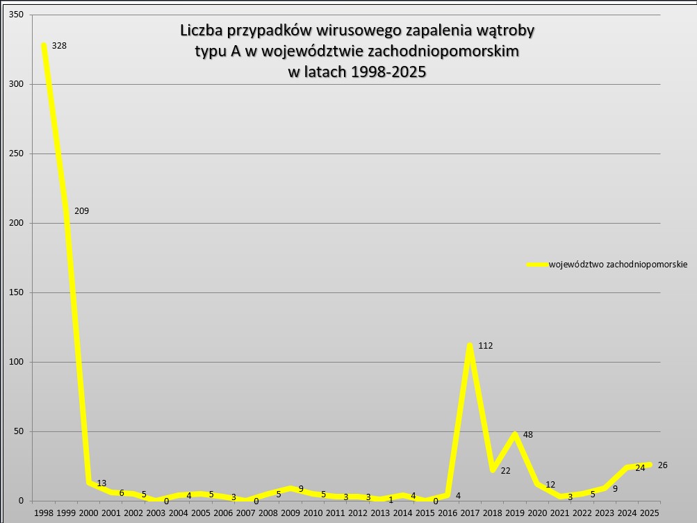 W Polsce w roku 2025 odnotowano znaczący wzrost zachorowań na wzw typu A (1085 przypadków w porównaniu do 318 w 2024 r.), natomiast w woj. zachodniopomorskim zarówno w 2024 jak i 2025 roku odnotowano nieznaczny wzrost zachorowań (24 i 26 w porównaniu do 9 przypadków w 2023 r.). W toku prowadzonego dochodzenia epidemiologicznego ustalone zostały 3 ogniska domowe zachorowań. Ponadto w niektórych przypadkach ustalona została seksualna droga transmisji zakażeń wśród mężczyzn mających seks z mężczyznami, a także wtórne zakażenia drogą pokarmową. Część chorych podała w wywiadach epidemiologicznych informację dot. spożywania m. in. surowych, niemytych warzyw i owoców, a także spożywania posiłków w lokalach gastronomicznych, które były wskazywane przez osoby chore jako miejsca spożywania posiłków.