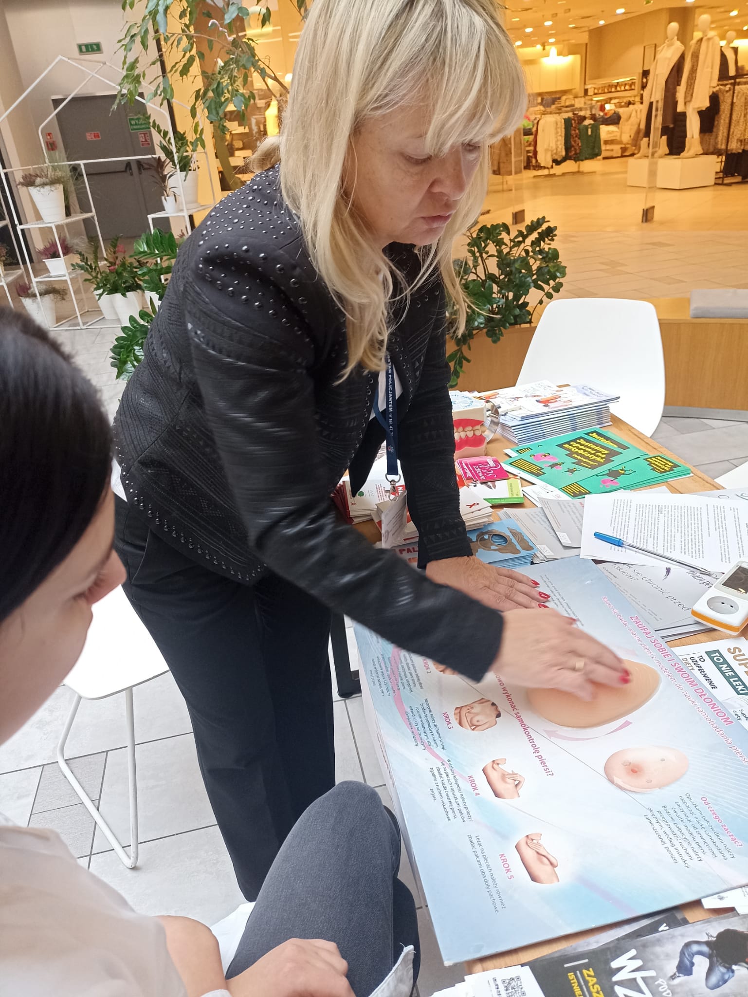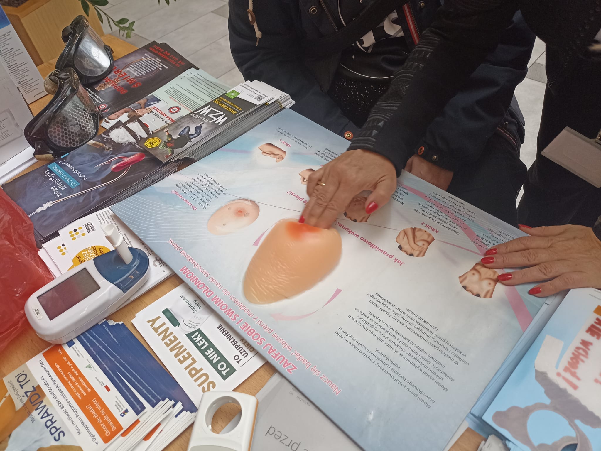 W trakcie stoiska przeprowadzano na fantomie instruktaż prawidłowego samobadania piersi oraz zrealizowano prowadzono pomiary profilaktyczne dla odwiedzających w zakresie: