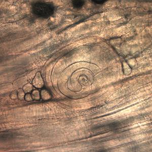 W mięsie znajdują się żywe larwy nicieni, które uwalniane są z cyst pod wpływem soku żołądkowego. Osobniki dojrzewają i rozmnażają się wieloetapowo w przewodzie pokarmowym, skąd drogą krwi trafiają głównie do mięśni. Ok. 20 dnia po zarażeniu larwy które wniknęły do komórek mięśniowych skręcają się spiralnie, tworzą torebkę i mogą pozostać żywe nawet przez kilkanaście lat. Z czasem kompleks ulega reakcji zapalnej, a po dłuższym czasie zwapnieniu.
