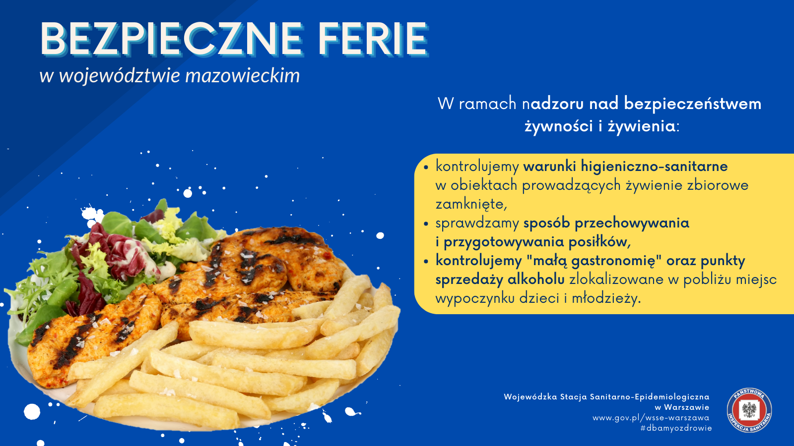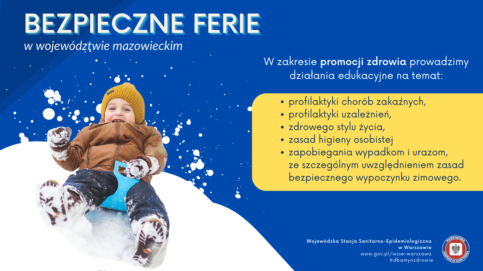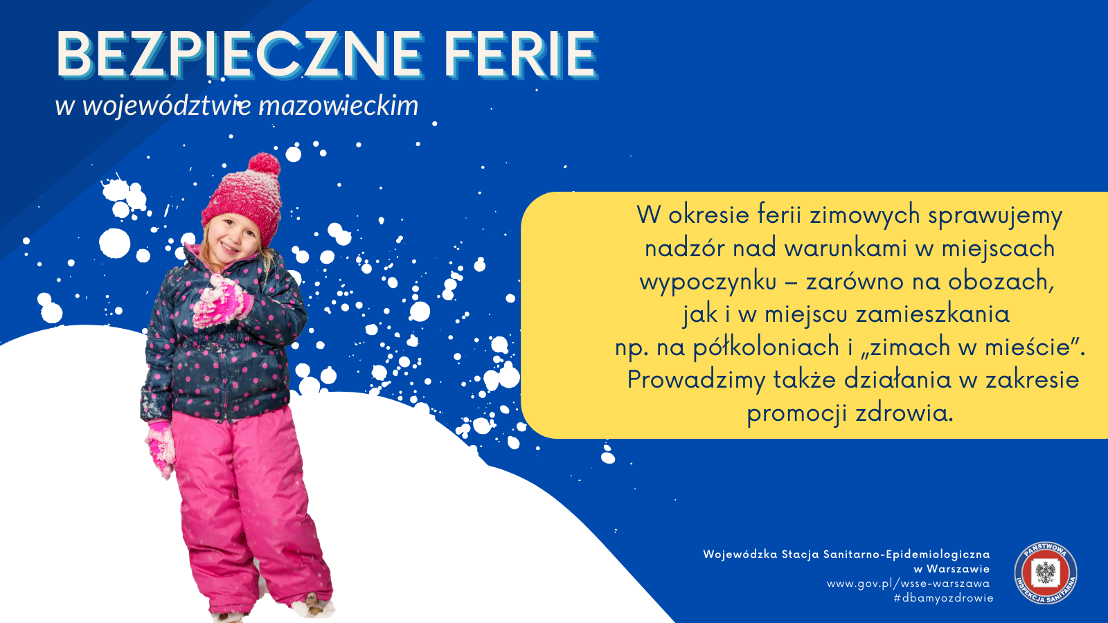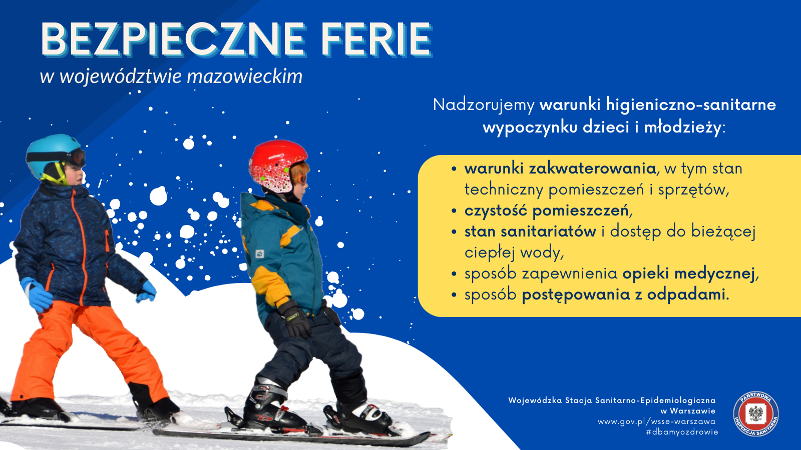 Państwowa Inspekcja Sanitarna dba o to, aby ferie zimowe były dla dzieci zdrowe i bezpieczne. W tym celu nadzorujemy miejsca wypoczynku znajdujące się na terenie województwa mazowieckiego.