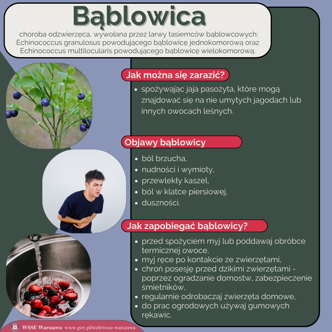 Bąblowica to choroba wywoływana przez larwy bąblowca, które mogą się znajdować na niemytych leśnych owocach – jagodach, poziomkach, jeżynach. Pasożyt ten jest roznoszony głównie przez lisy, ale także psy.