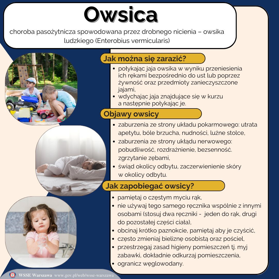 Owsica jest najczęściej występującą chorobą pasożytniczą. Występuje przede wszystkim u dzieci w wieku przedszkolnym i szkolnym. Owsiki (Enterobius vermicularis) bytują głównie w jelicie grubym. Wyglądem przypominają białe, cienkie i długie nitki. Można je dostrzec gołym okiem. Dzieci zarażają się owsikami przede wszystkim podczas wspólnej zabawy, w wyniku dotykania tych samych przedmiotów oraz korzystania ze wspólnych toalet.