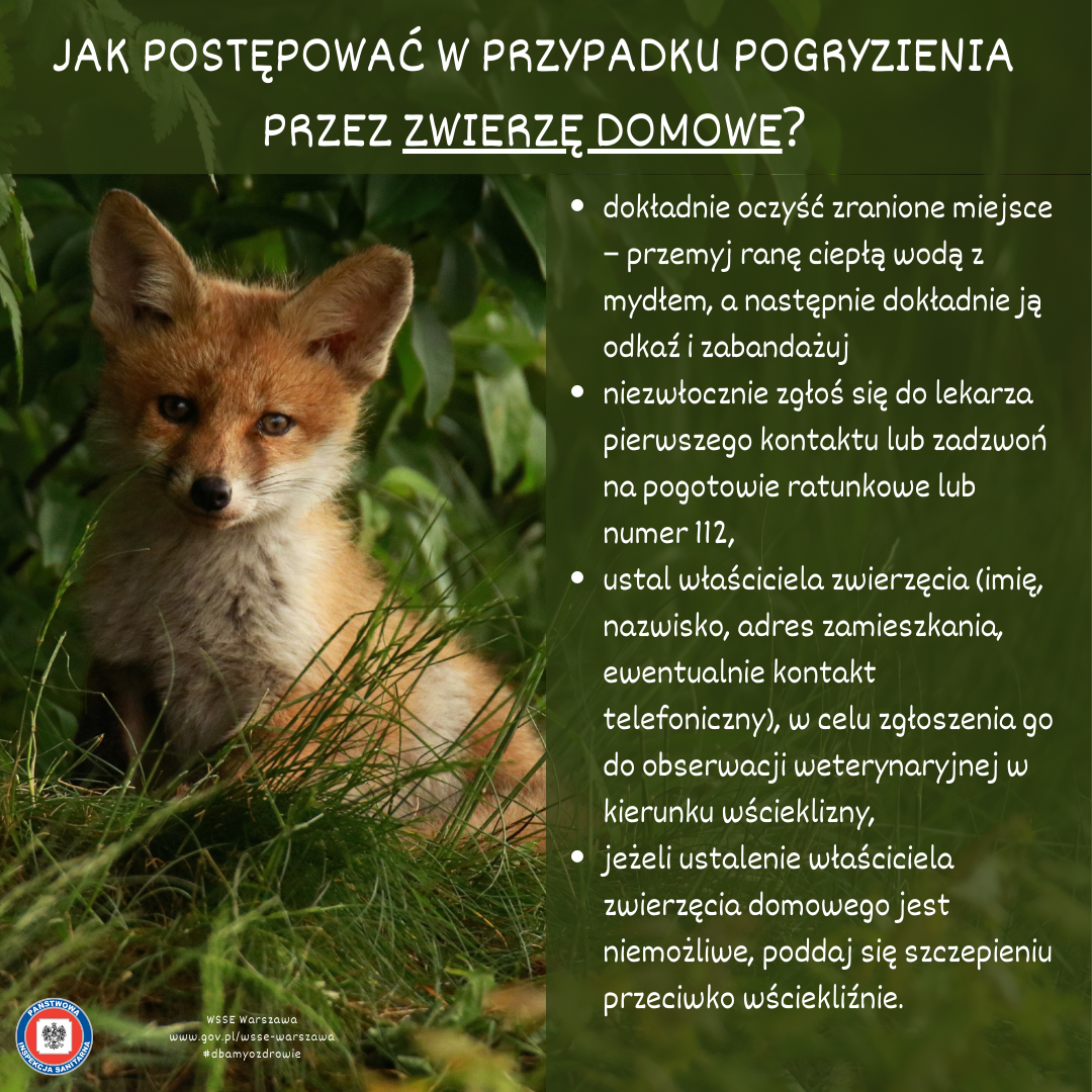 - w przypadku pogryzienia przez zwierzęta domowe, należy ustalić właściciela zwierzęcia (imię, nazwisko, adres zamieszkania, ewentualnie kontakt telefoniczny), w celu zgłoszenia go do obserwacji weterynaryjnej w kierunku wścieklizny,