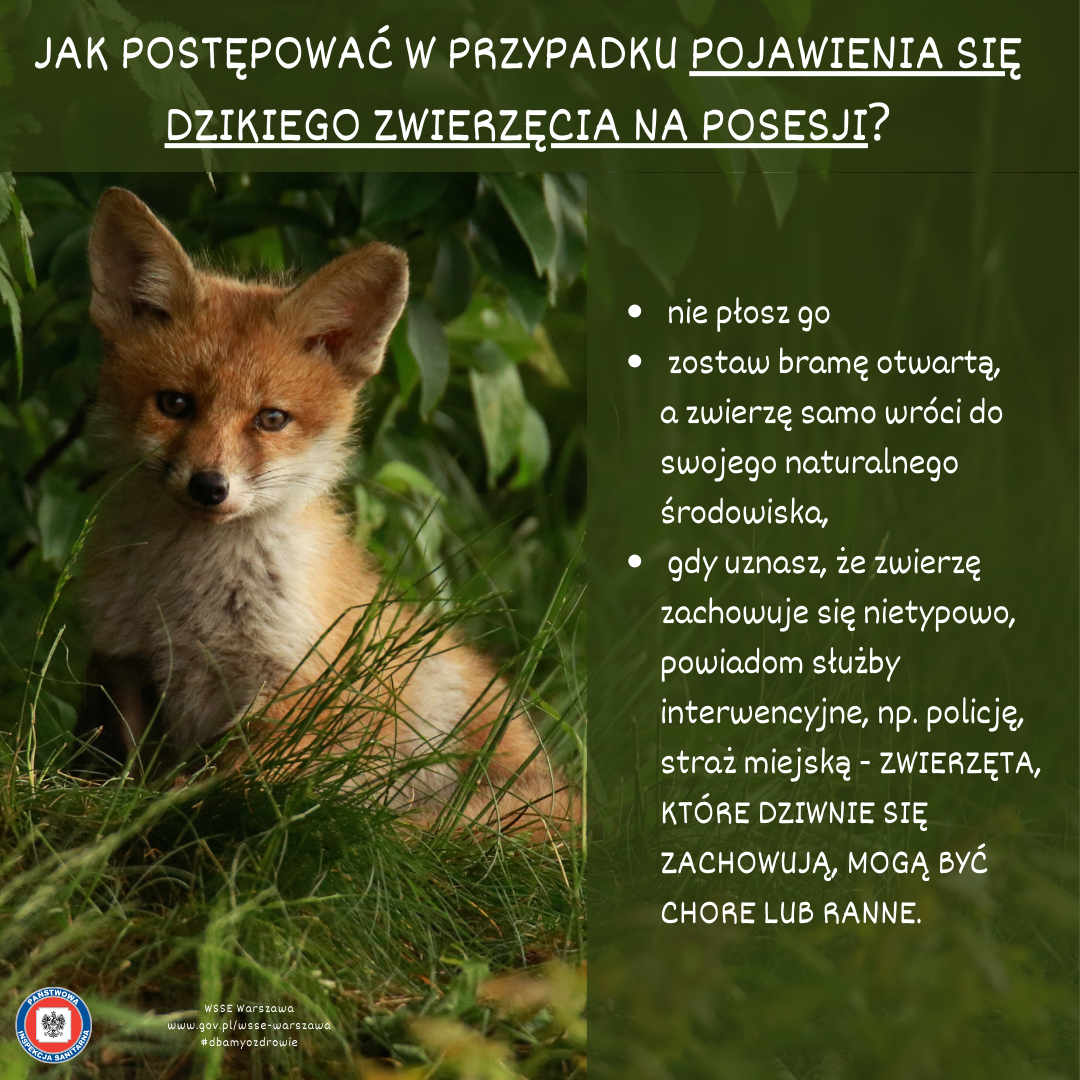 - gdy uznasz, że zwierzę zachowuje się nietypowo, powiadom służby interwencyjne, np. policję, straż miejską lub Powiatowego Lekarza Weterynarii - ZWIERZĘTA, KTÓRE DZIWNIE SIĘ ZACHOWUJĄ, MOGĄ BYĆ CHORE LUB RANNE.