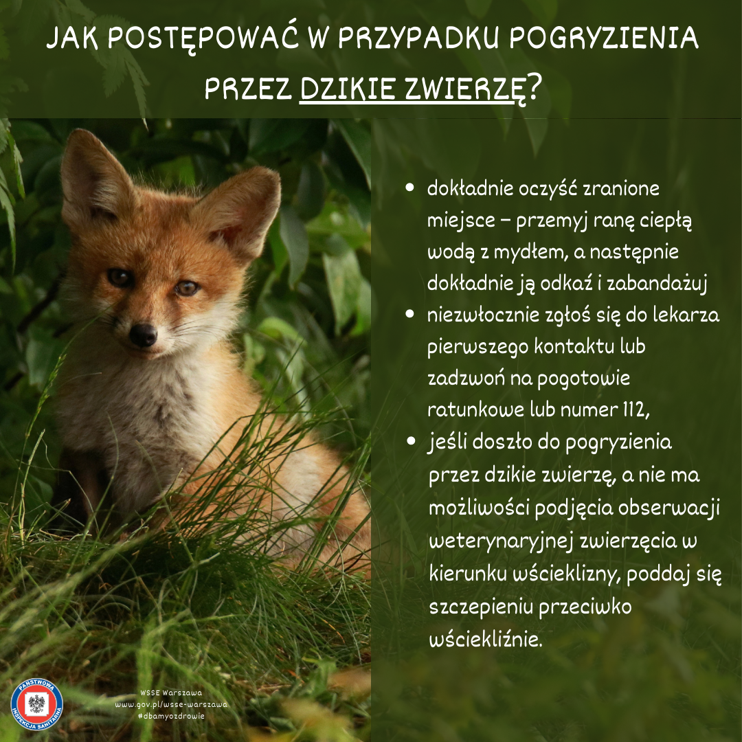 - jeśli doszło do pogryzienia przez dzikie zwierzę, a nie ma możliwości podjęcia obserwacji weterynaryjnej zwierzęcia w kierunku wścieklizny, poddaj się szczepieniu przeciwko wściekliźnie,