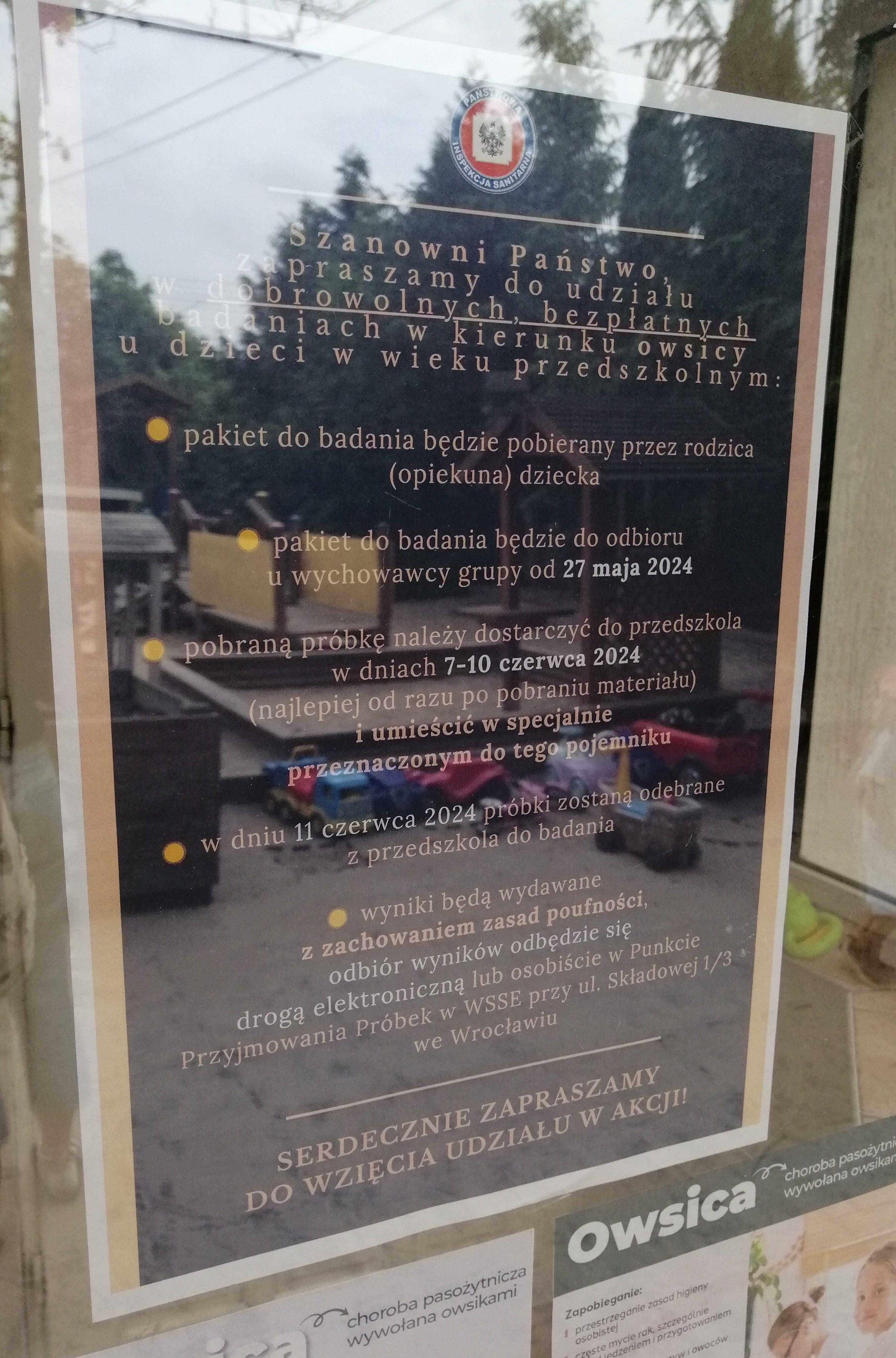 Wychodząc naprzeciw wciąż obecnemu problemowi w dniach 27.05.2024 r. – 11.06.2024 r. Dział Zdrowia Publicznego i Komunikacji wspólnie z Oddziałem Mikrobiologii - Laboratorium Mikrobiologii i Parazytologii WSSE we Wrocławiu po raz kolejny prowadzi akcję profilaktyczną - badania parazytologiczne w kierunku owsicy kierowane do dzieci, której celem jest przeprowadzenie dobrowolnych, bezpłatnych badań w kierunku owsicy u dzieci w wieku przedszkolnym.