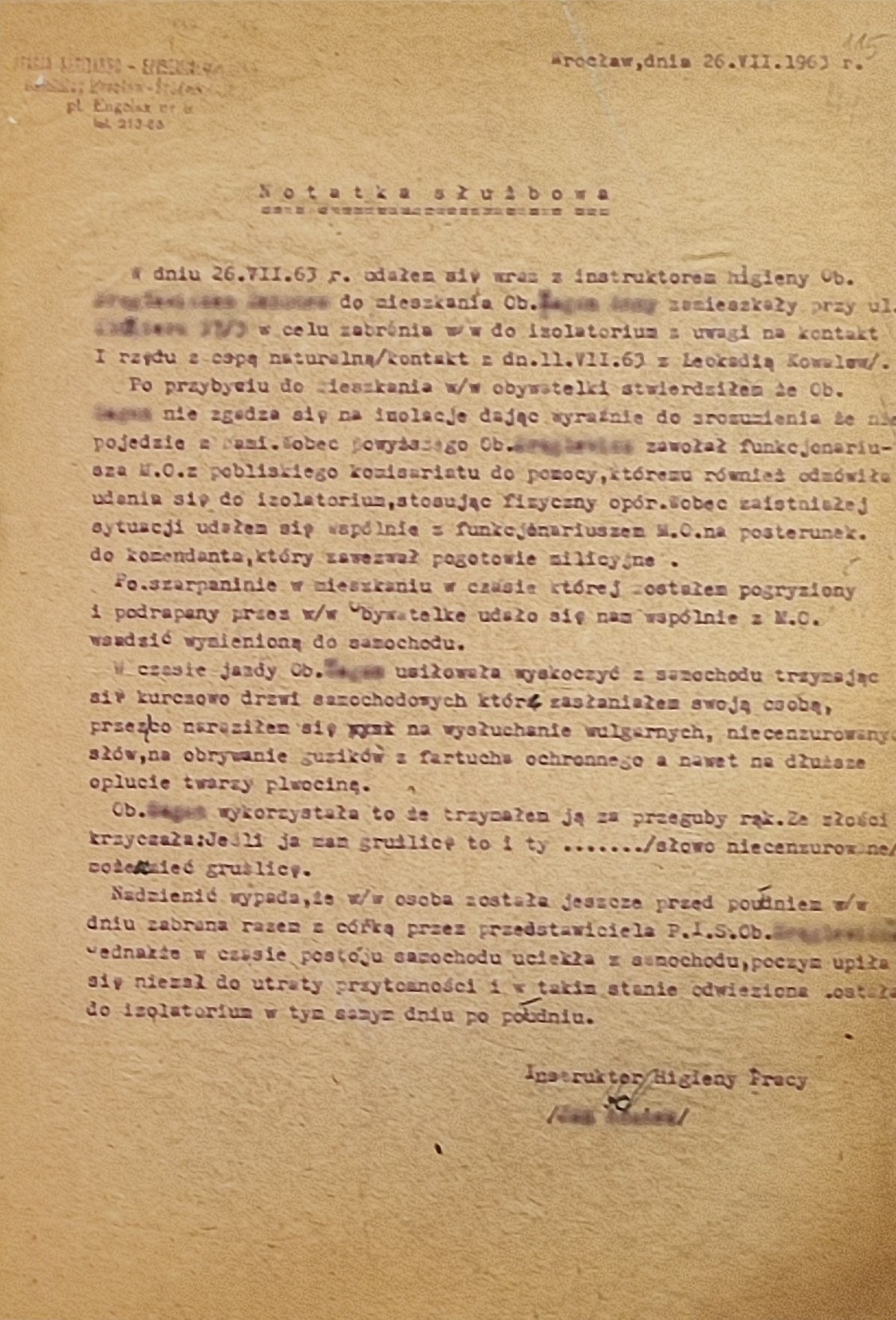 W dniu 26.VII.63 r. udałem się wraz z instruktorem higieny Ob. (nazwisko zamazane) do mieszkania Ob. (nazwisko zamazane) zamieszkały przy ul. (adres zamazany) w celu zabrania w/w do izolatorium z uwagi na kontakt I rzędu z ospą naturalną/kontakt z dn.11.VII.63 z Leokadią (nazwisko nieczytelne)/.
