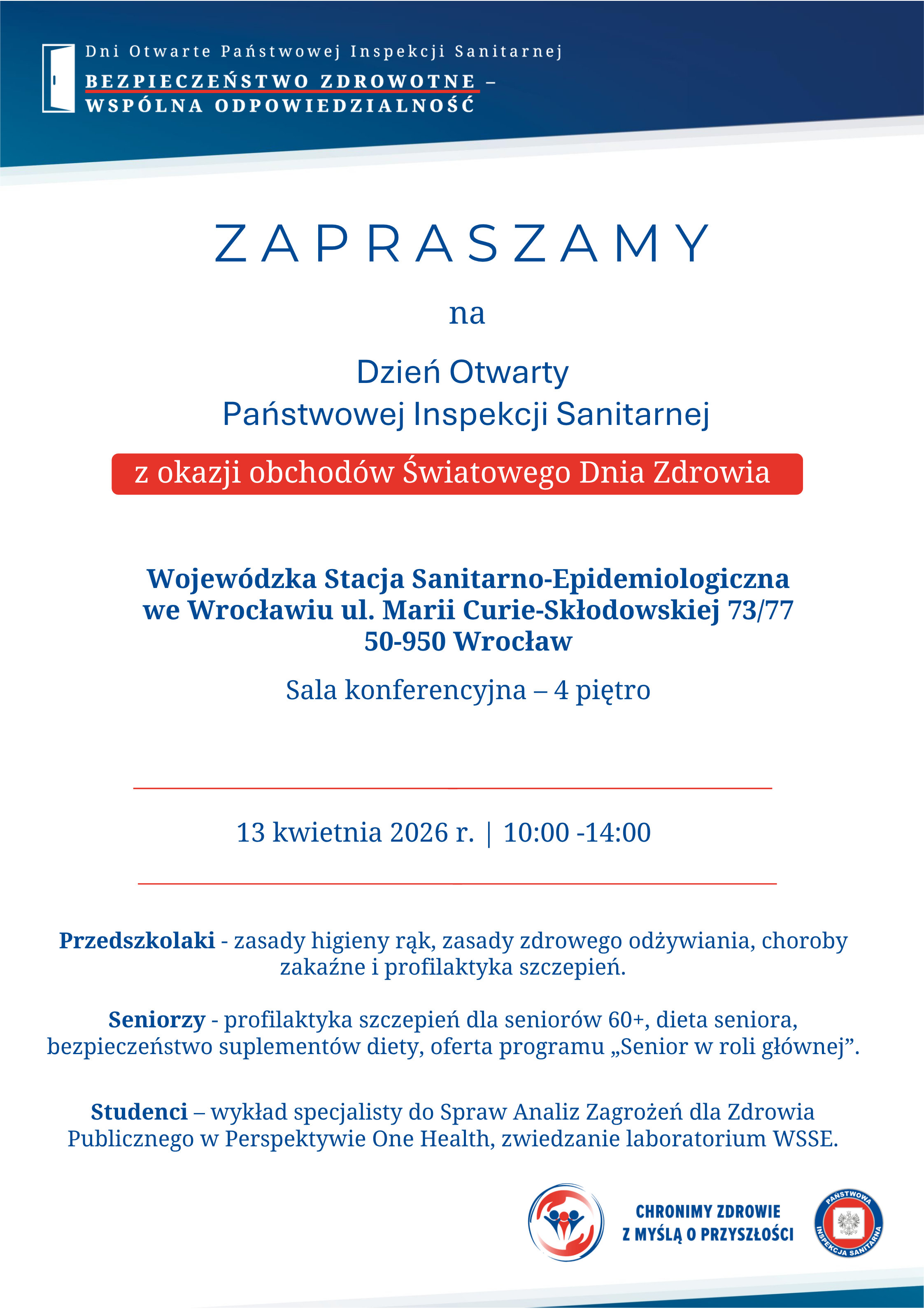 13 kwietnia 2026 r. zapraszamy na Dni Otwarte Państwowej Inspekcji Sanitarnej w ramach obchodów Światowego Dnia Zdrowia, które odbędą się w Wojewódzkiej Stacji Sanitarno-Epidemiologicznej we Wrocławiu.