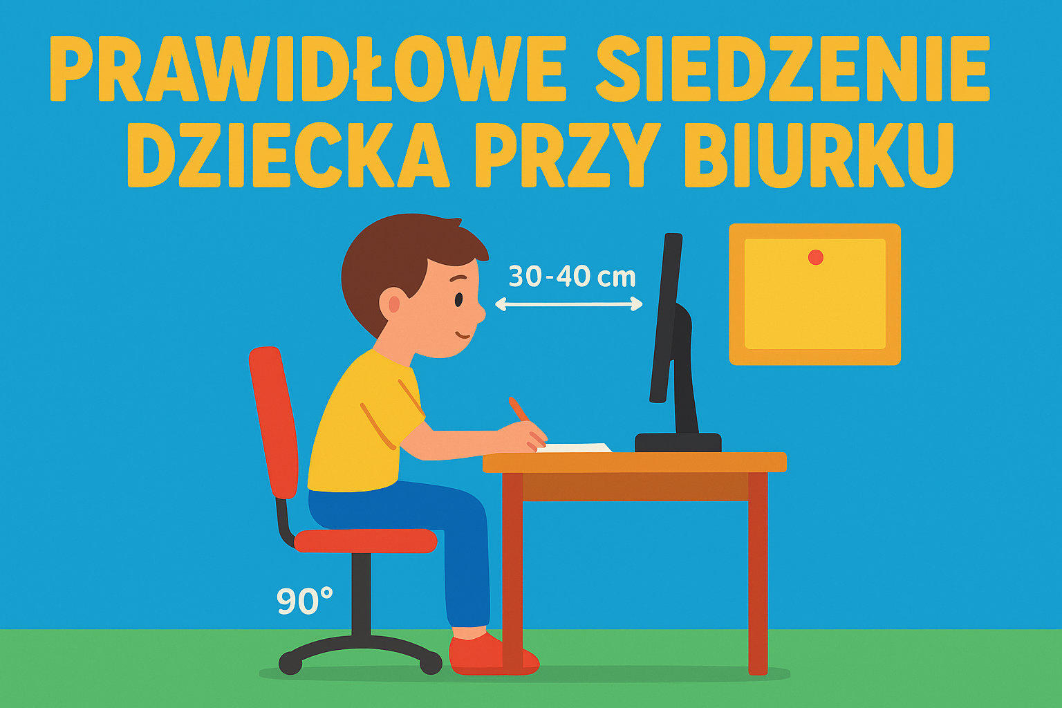 Możesz też uczyć dziecko „zasady 90°–90°–90°” (kąt w stawach biodrowych, kolanach i łokciach), a łatwo zapamięta, jak siedzieć.