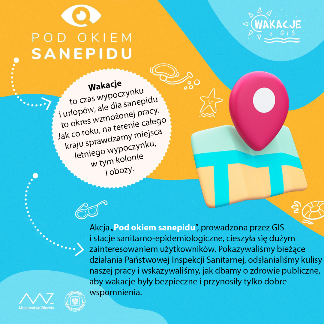 O tym, co szczególnie kontrolujemy latem, informowaliśmy w mediach społecznościowych między 7-9.08.2023 r. Akcja „Pod okiem sanepidu”, prowadzona przez GIS i stacje sanitarno-epidemiologiczne, cieszyła się dużym zainteresowaniem użytkowników. Pokazywaliśmy bieżące działania Państwowej Inspekcji Sanitarnej, odsłanialiśmy kulisy naszej pracy i wskazywaliśmy, jak dbamy o zdrowie publiczne, aby wakacje były bezpieczne i przynosiły tylko dobre wspomnienia.
