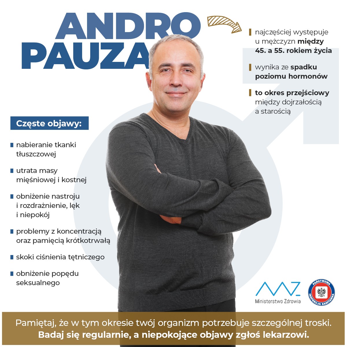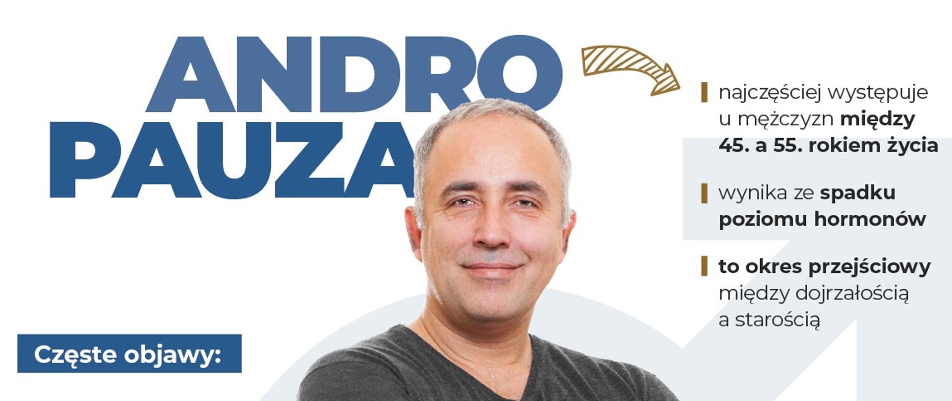 Andropauza, to etap w życiu mężczyzny, gdy w wyniku stopniowego obniżania poziomu niektórych hormonów pojawiają się objawy znacząco wpływające na jakość życia. Według statystyk andropauza dotyka ok. połowę mężczyzn po 55 roku życia.