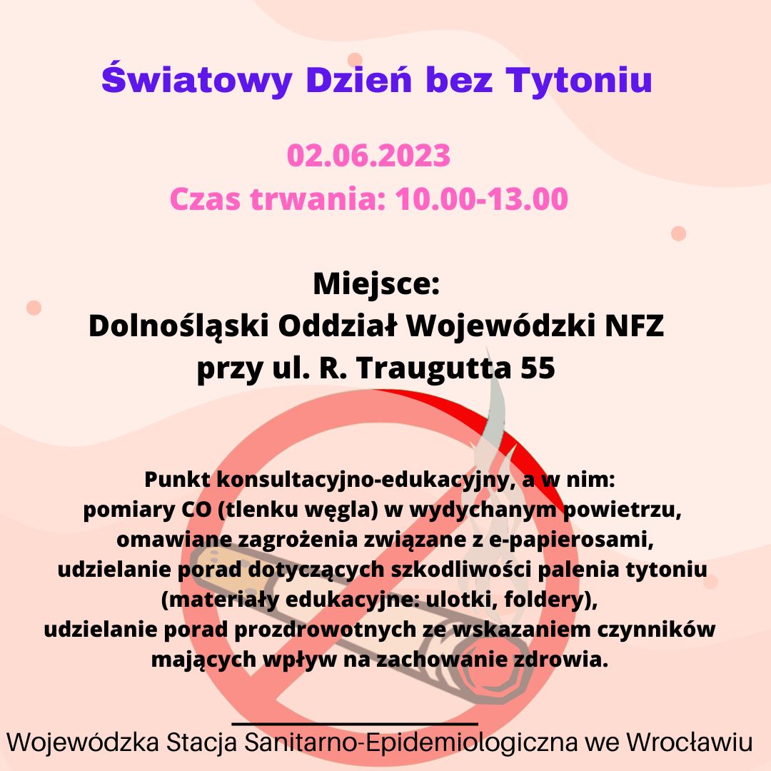 Tegoroczne obchody Światowego Dnia bez Tytoniu pracownicy Działu Zdrowia Publicznego i Promocji Zdrowia rozpoczęli od akcji informacyjno-edukacyjnej kierowanej do klientów WSSE we Wrocławiu jak również do pracowników tutejszej stacji. Celem tej akcji jest zwrócenie uwagi społeczeństwu jakie skutki zdrowotne wynikają z palenia tytoniu.