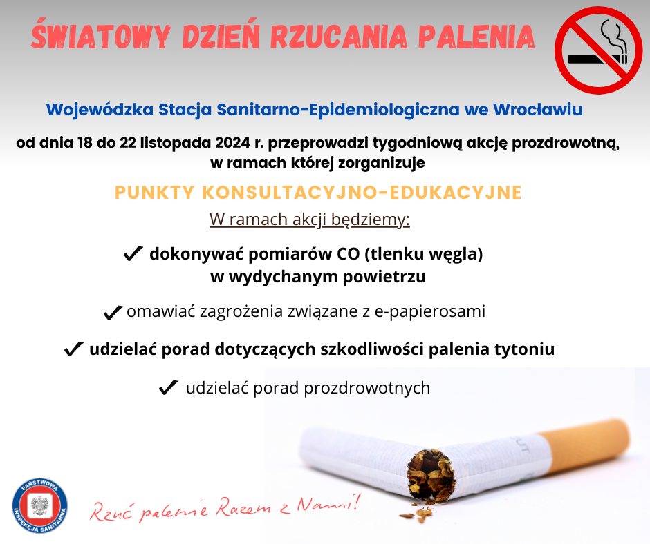 W związku ze Światowym Dniem Rzucania Palenia Wojewódzka Stacja Sanitarno-Epidemiologiczna we Wrocławiu od dnia 18 do 22 listopada 2024 r. przeprowadzi tygodniową akcję prozdrowotną, w ramach której zorganizuje punkty konsultacyjno-edukacyjne:
