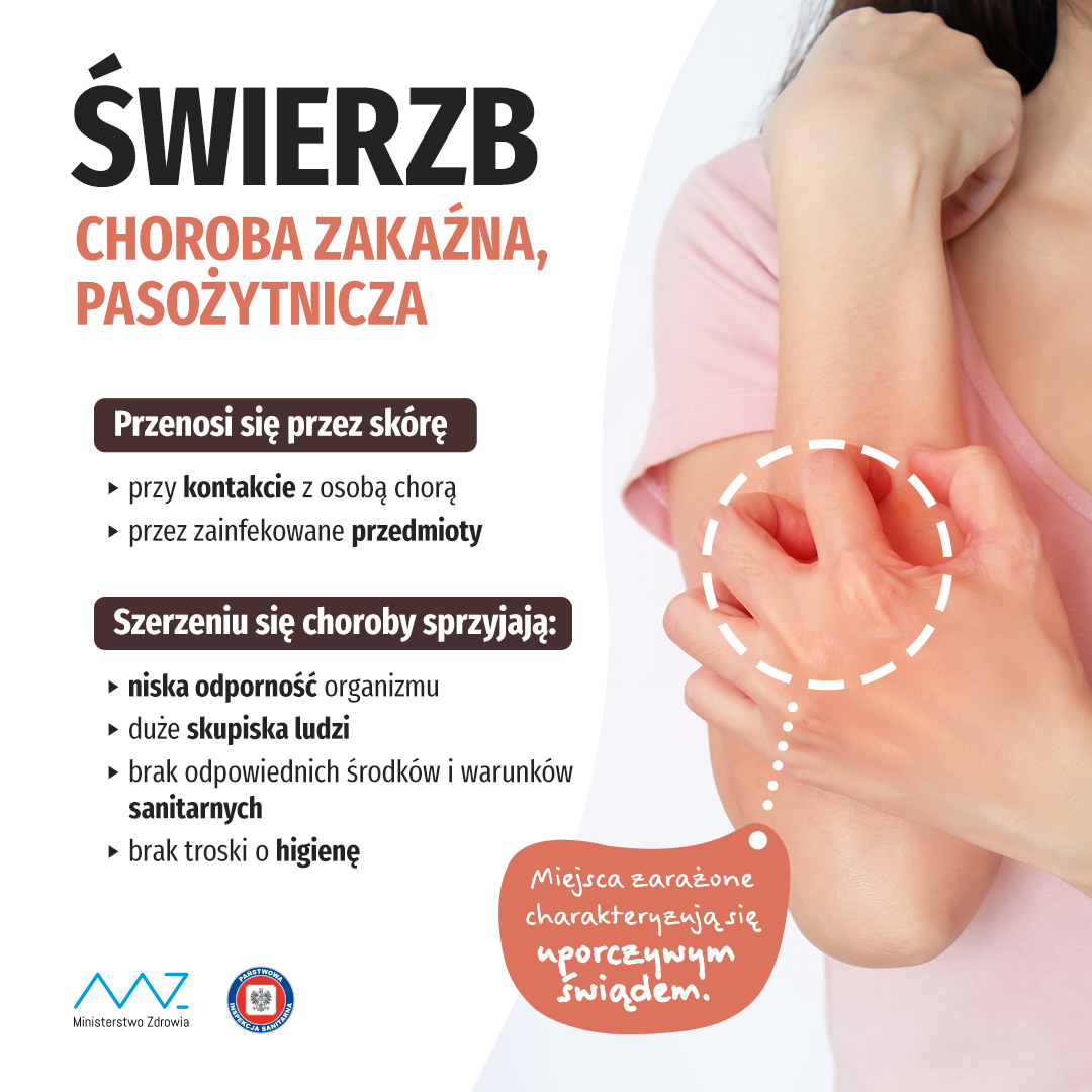 Świerzb to choroba zakaźna skóry, która rozwija się po wniknięciu samicy świerzbowca w naskórek. Pasożyt drąży mikroskopijne kanaliki, w których składa jaja. Objawy pojawiają się zwykle po 3–6 tygodniach od zarażenia (w przypadku pierwszego kontaktu) lub szybciej, jeśli do infekcji dochodzi ponownie.
