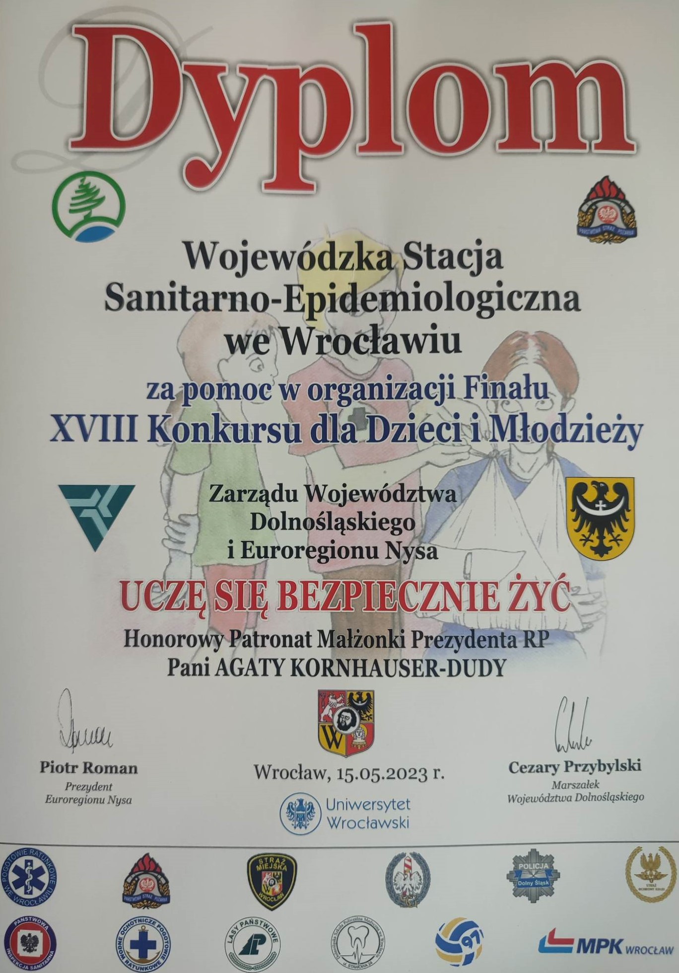 Dnia 15 maja 2023 roku w zabytkowych pomieszczeniach Gmachu Głównego Uniwersytetu Wrocławskiego odbył się finał 18 edycji Konkursu dla Dzieci i Młodzieży "Uczę się bezpiecznie żyć".