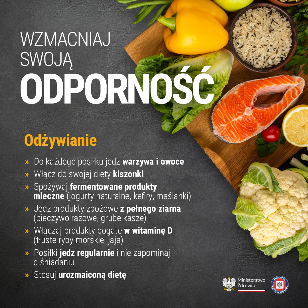 Podczas wzmacniania odporności polecane są warzywa i owoce będące dobrym źródłem witaminy C, która m.in.: wzmacnia system immunologiczny organizmu, zmniejszając podatność na zakażenia bakteryjne i wirusowe, pomaga zachować dobry stan ścian naczyń krwionośnych, jest najpowszechniejszym przeciwutleniaczem. Dobrym źródłem witaminy C jest: kapusta, papryka, brokuły, kalafior, truskawki, porzeczki, natka pietruszki, pomarańcze, kiwi. Ważna jest także witaminę A (β-karoten), która chroni organizm przed infekcjami, odpowiada za dobry wzrok i stan skóry. Warto włączyć do swojego jadłospisu takie produkty jak: dynia, marchew, papryka, pomidory, jarmuż.