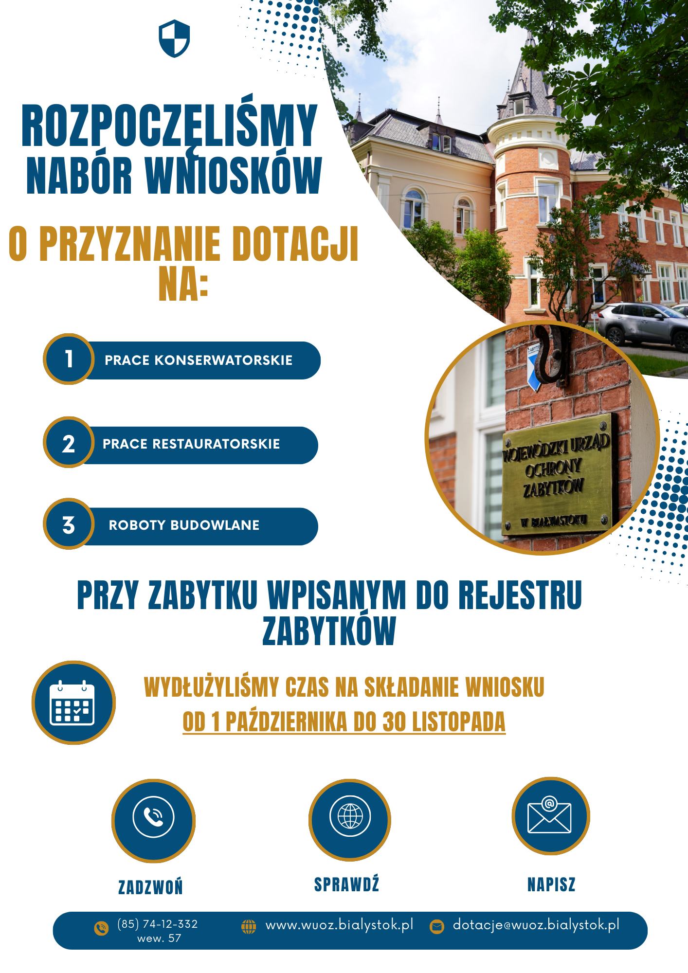 Dziś, 1 października, rozpoczynamy nabór wniosków o przyznanie dotacji na prace konserwatorskie, restauratorskie oraz roboty budowlane przy zabytkach wpisanych do rejestru zabytków!