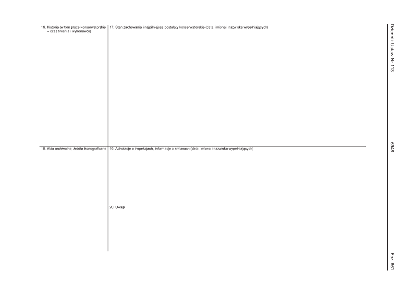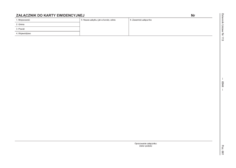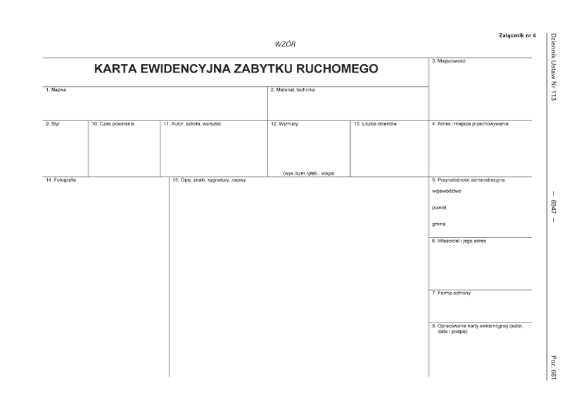 Dotychczas wnioskodawcy posługiwali się tzw. białą kartą zabytku techniki. W oparciu o powyższe rozporządzenie obowiązującym dokumentem jest karta ewidencyjna zabytku ruchomego, zgodna z załącznikiem nr 4 wyżej wymienionego rozporządzenia.