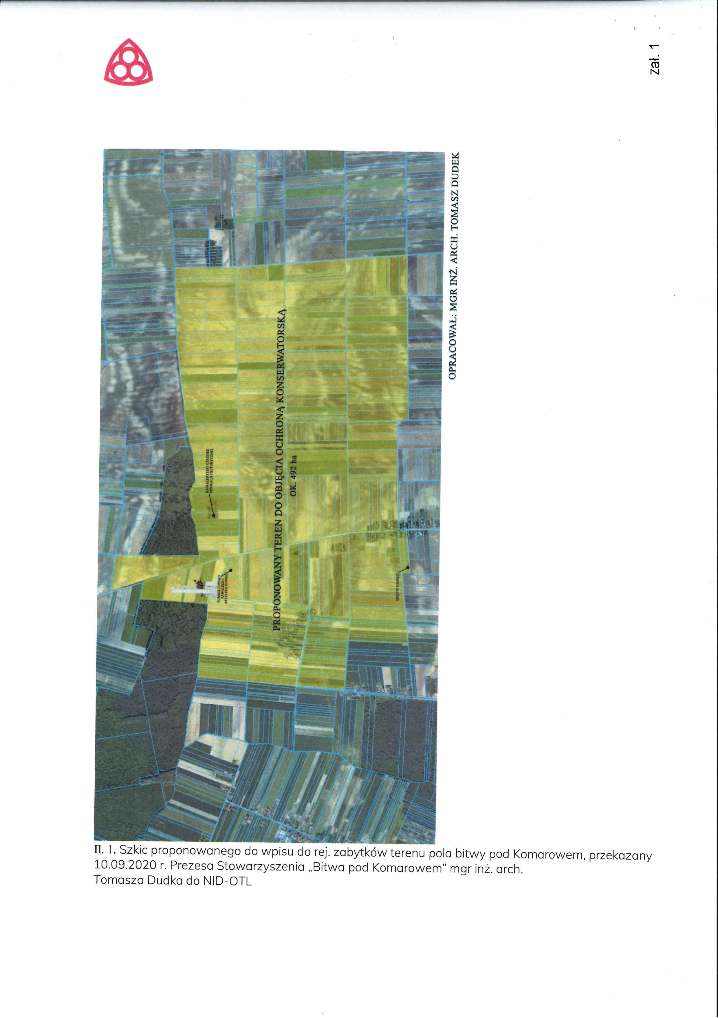 Zawiadomienie z dnia 11 kwietnia 2024 r. o wszczętym postępowaniu administracyjnym w sprawie wpisania do rejestru zabytków nieruchomych województwa lubelskiego: krajobrazu kulturowego pola bitwy pod Komarowem z 31 sierpnia 1920 r., tj. obszaru w granicach oznaczonych na szkicu stanowiącym integralną część opinii eksperckiej Narodowego Instytutu Dziedzictwa z 28 września 2020 r., znak: DSK.5111.13.2020.EP (kopia w załączeniu - zał. 1), który obejmuje nieruchomości zarejestrowane w ewidencji gruntów i budynków powiatu zamojskiego jako niżej wymienione działki, położone w obrębach ewidencyjnych.
