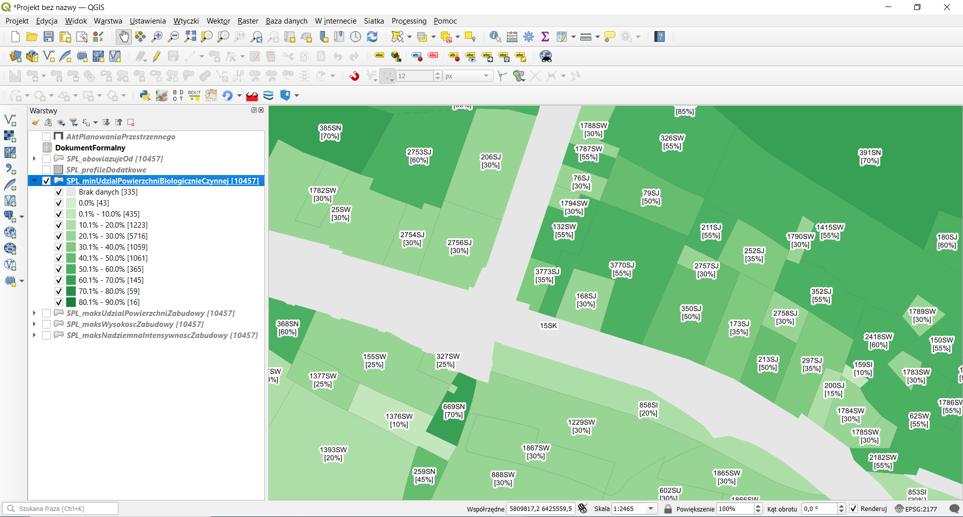 W sekcji „Zdjęcia” dodane zostały widoki z nowej wersji Wtyczki, przedstawiające funkcję wczytywania projektu QGIS oraz wizualizacji ustaleń POG na przykładzie wartości parametru minimalnego udziału powierzchni biologicznie czynnej.