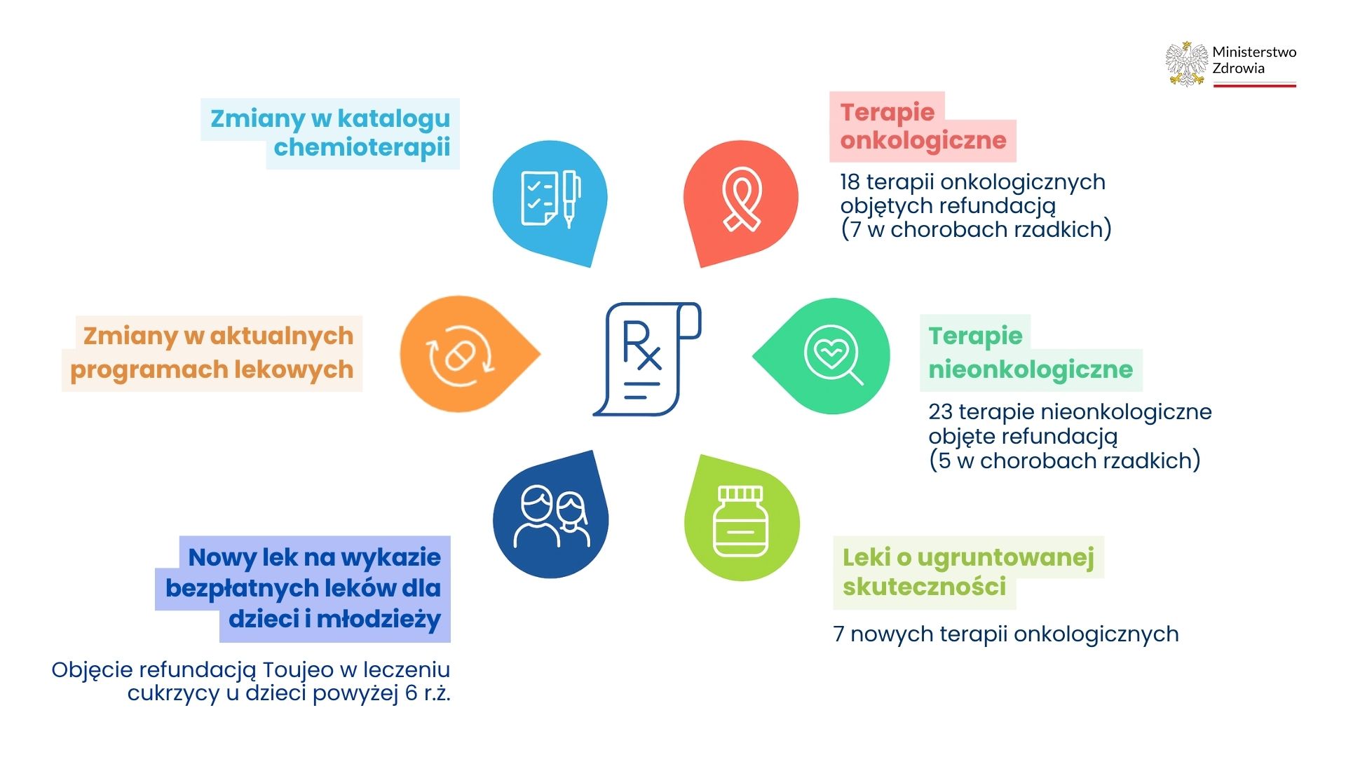 Na lipcowej liście leków refundowanych znajdzie się 18 terapii onkologicznych - w tym 7 w chorobach rzadkich - oraz 23 terapie nieonkologiczne - 5 w chorobach rzadkich. Trzecia w tym roku lista będzie obowiązywać od 1 lipca 2025 r.