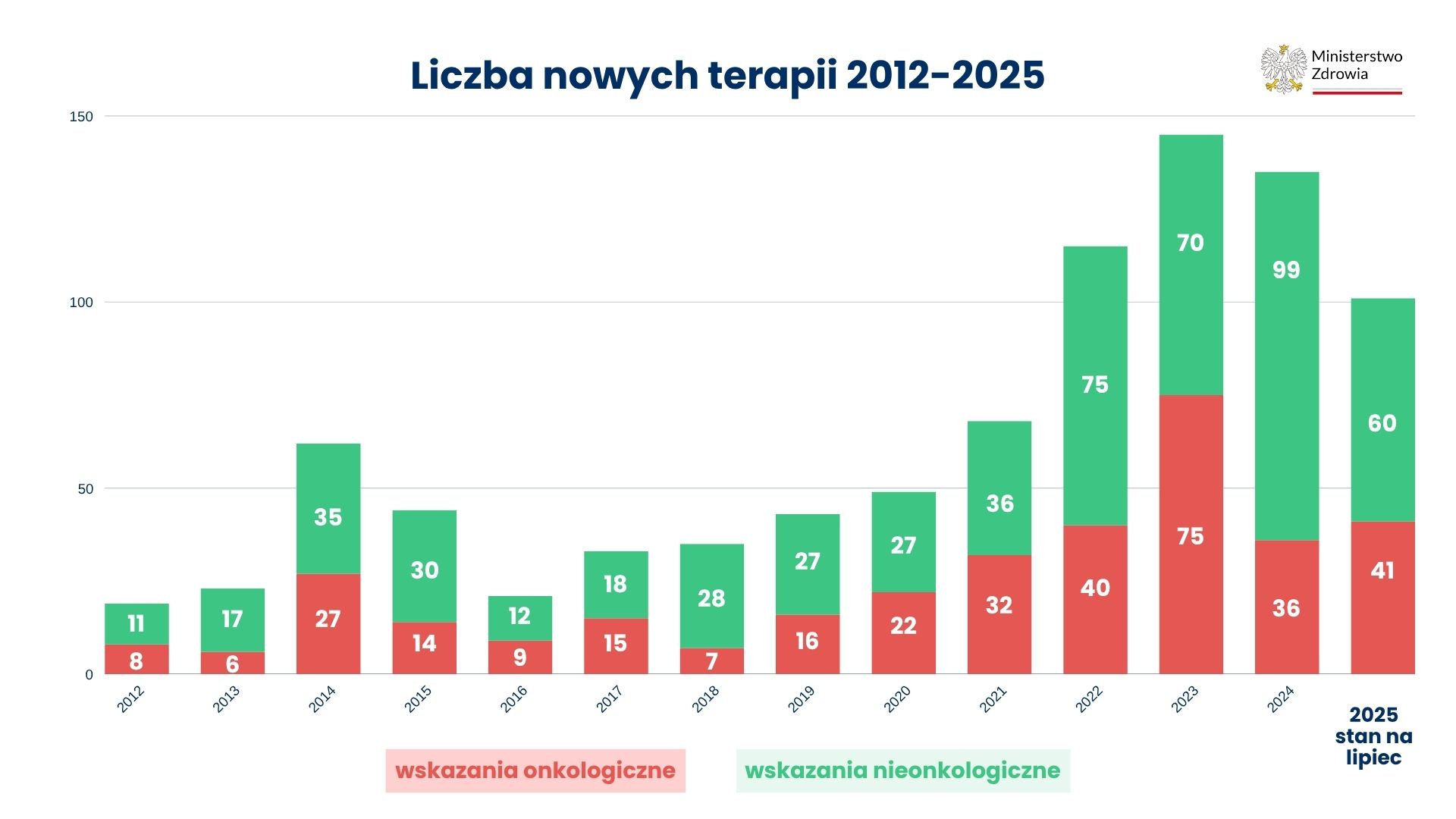 Wiceminister zdrowia wskazuje, że udało się wprowadzić 7 nowych terapii z listy o ugruntowanej skuteczności w onkologii. Są to terapie we wskazaniach takich jak białaczka, rak piersi, płuc, jelita grubego czy wątroby. To zasługa szybszego procedowania wniosków. "W przypadku leków o ugruntowanej skuteczności w onkologii - z listy ogłoszonej w maju - czas procedowania wyniósł zaledwie około 18 dni".