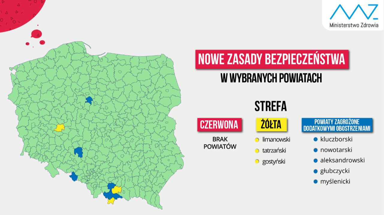 Wiceminister na konferencji podał także aktualną listę powiatów, w których od soboty obowiązywać będą dodatkowe obostrzenia. Do strefy czerwonej nie zaliczono żadnego powiatu. W strefie żółtej znalazły się trzy: limanowski (przeniesiony ze strefy czerwonej), tatrzański (ponownie na liście ze strefy zielonej), gostyński (nowy na liście).
