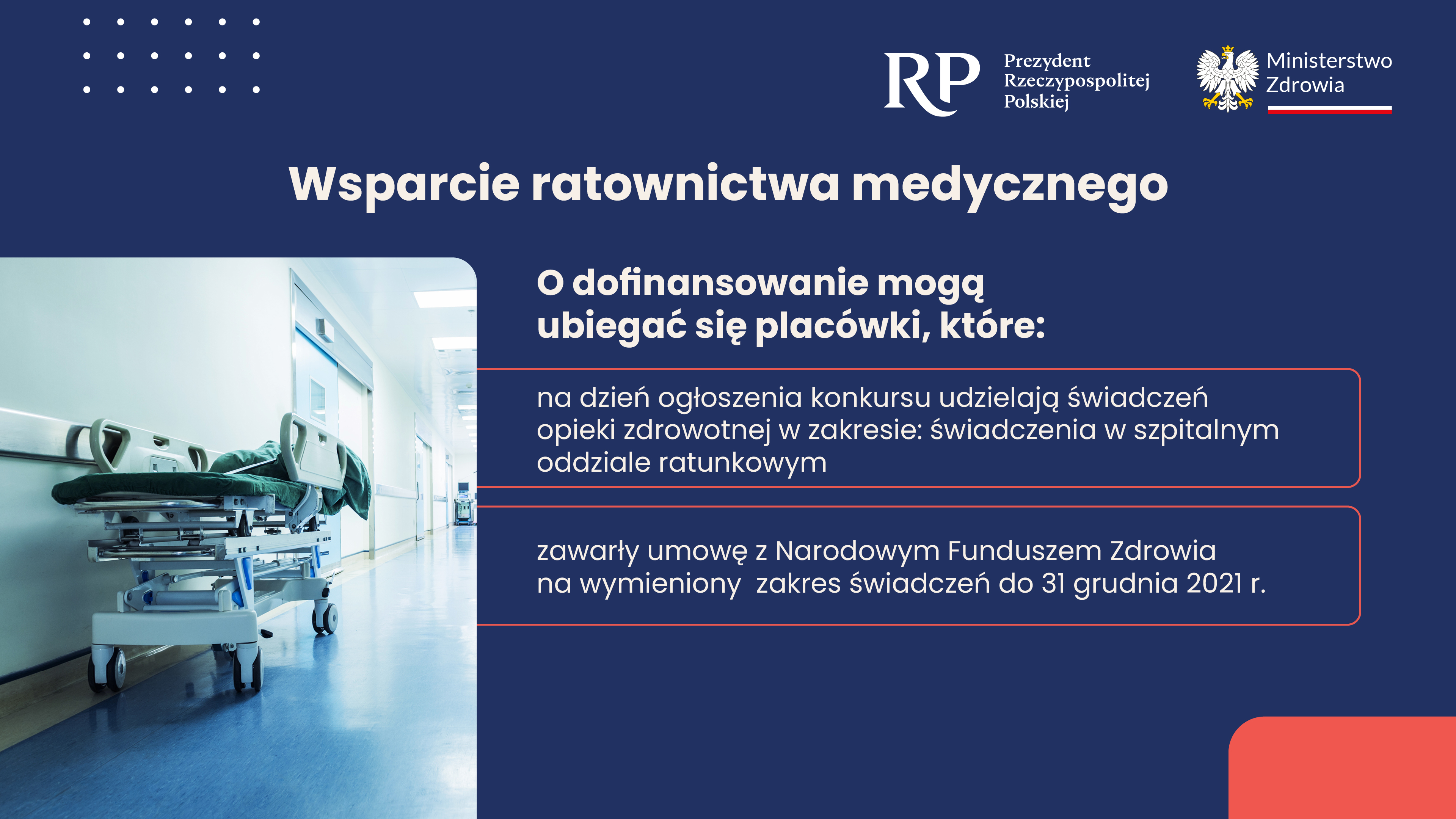 O dofinansowanie z Funduszu Medycznego, mogą ubiegać się placówki, które na dzień ogłoszenia konkursu udzielają świadczeń opieki zdrowotnej w zakresie: świadczenia w szpitalnym oddziale ratunkowym. Drugim warunkiem skorzystania z dofinansowania jest zawarcie umowy z Narodowym Funduszem Zdrowia na wymieniony zakres świadczeń do 31 grudnia 2021 r.