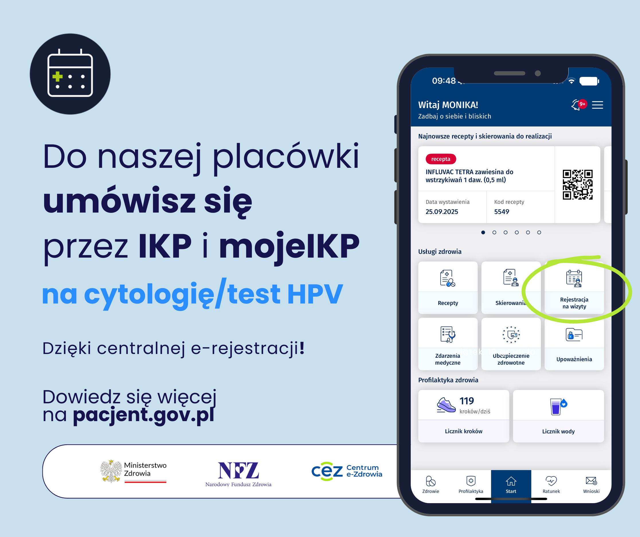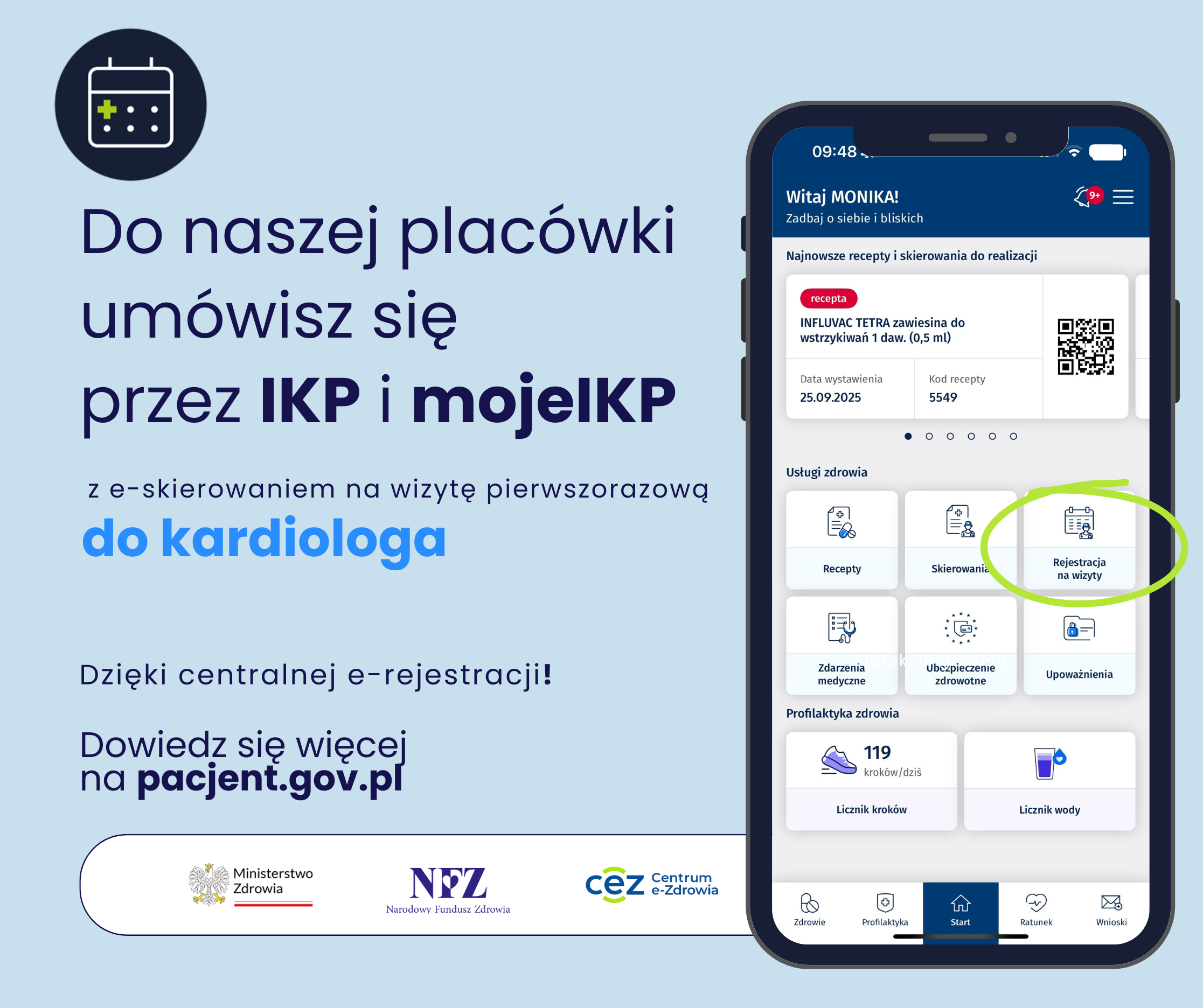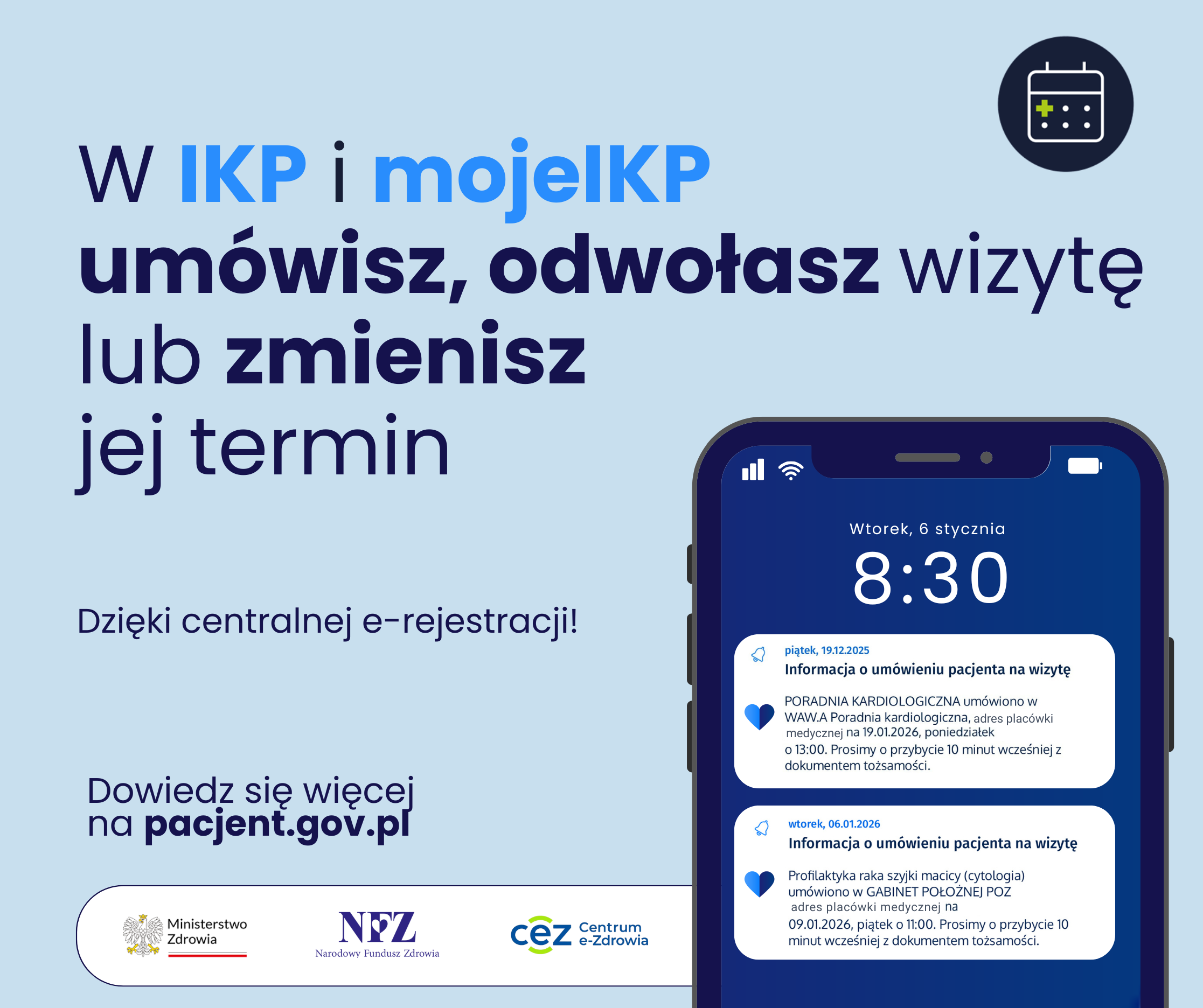 - pacjent będzie mógł umawiać się na wizytę nie tylko osobiście lub telefonicznie w placówce, ale także online — za pośrednictwem Internetowego Konta Pacjenta (pacjent.gov.pl) oraz aplikacji mobilnej mojeIKP,