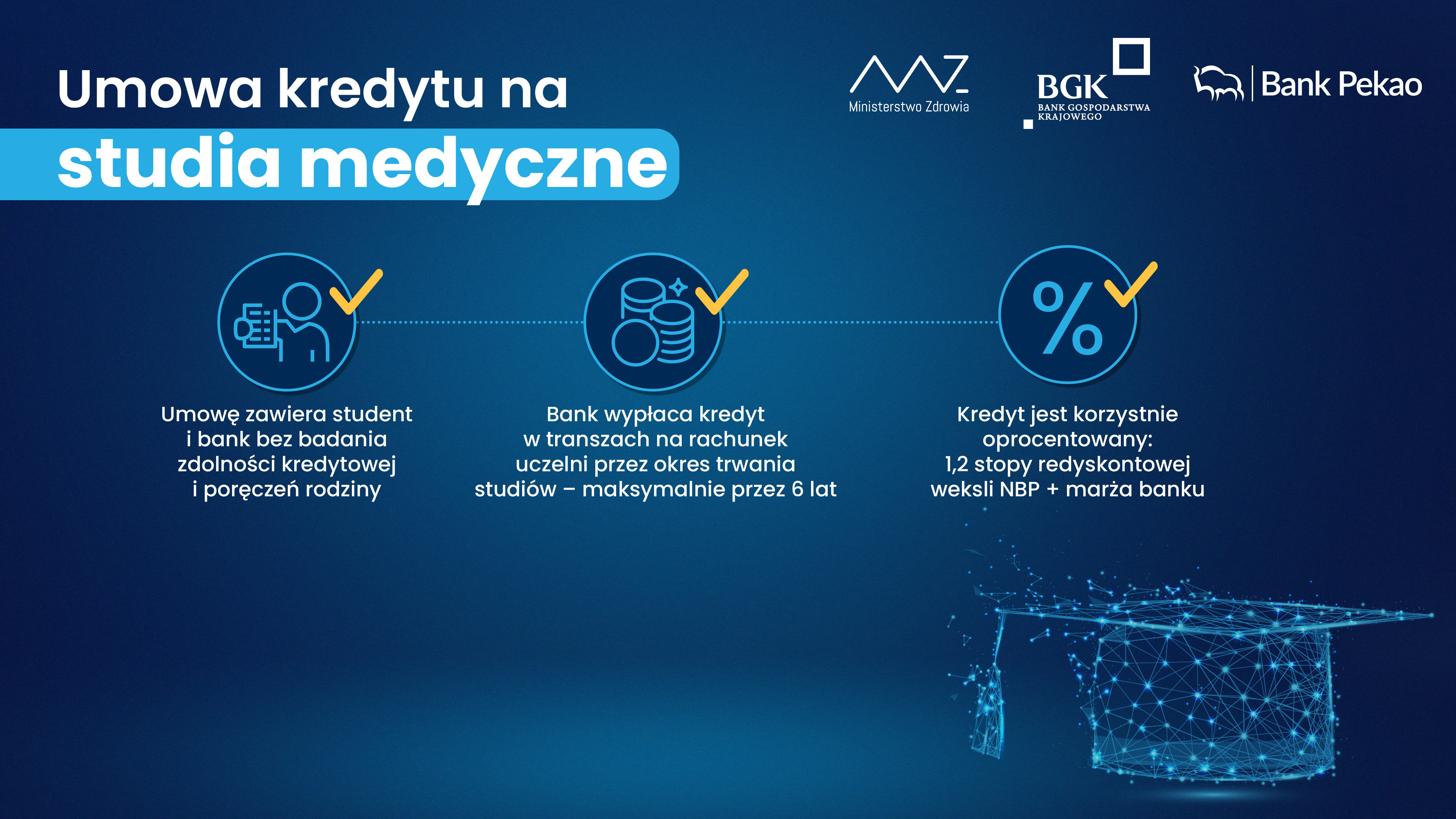Już w lipcu studenci będą mogli złożyć wniosek o kredyt na studia medyczne. Ministerstwo Zdrowia we współpracy z Bankiem Gospodarstwa Krajowego uruchomiło Fundusz Kredytowania Studiów Medycznych. Preferencyjnych kredytów od 18 lipca 2022 r. udzielać będzie Bank Pekao S.A. Fundusz pomoże sfinansować odpłatne studia medyczne i zwiększyć liczbę lekarzy w Polsce.