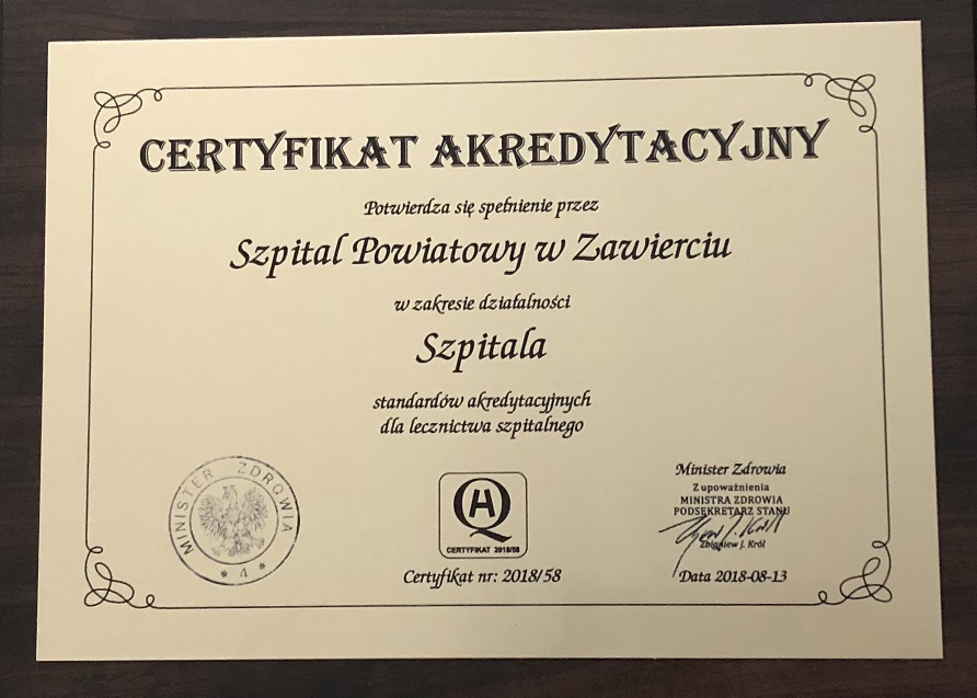 Wiceminister zdrowia Maciej Miłkowski wręczył Certyfikat Akredytacyjny Ministra Zdrowia. Symboliczny Certyfikat przekazano na ręce Dyrektor Szpitala Anny Pilarczyk- Sprycha i Z-cy Dyrektora ds. Lecznictwa- Sławomira Milki. Podczas uroczystości głos zabrali m.in. Wicemarszałek Sejmu RP- Barbara Dolniak, Poseł na Sejm RP Waldemar Andzel, Starosta Powiatu Zawierciańskiego- Krzysztof Wrona oraz Członek Zarządu Powiatu Zawierciańskiego- Maria Milejska.