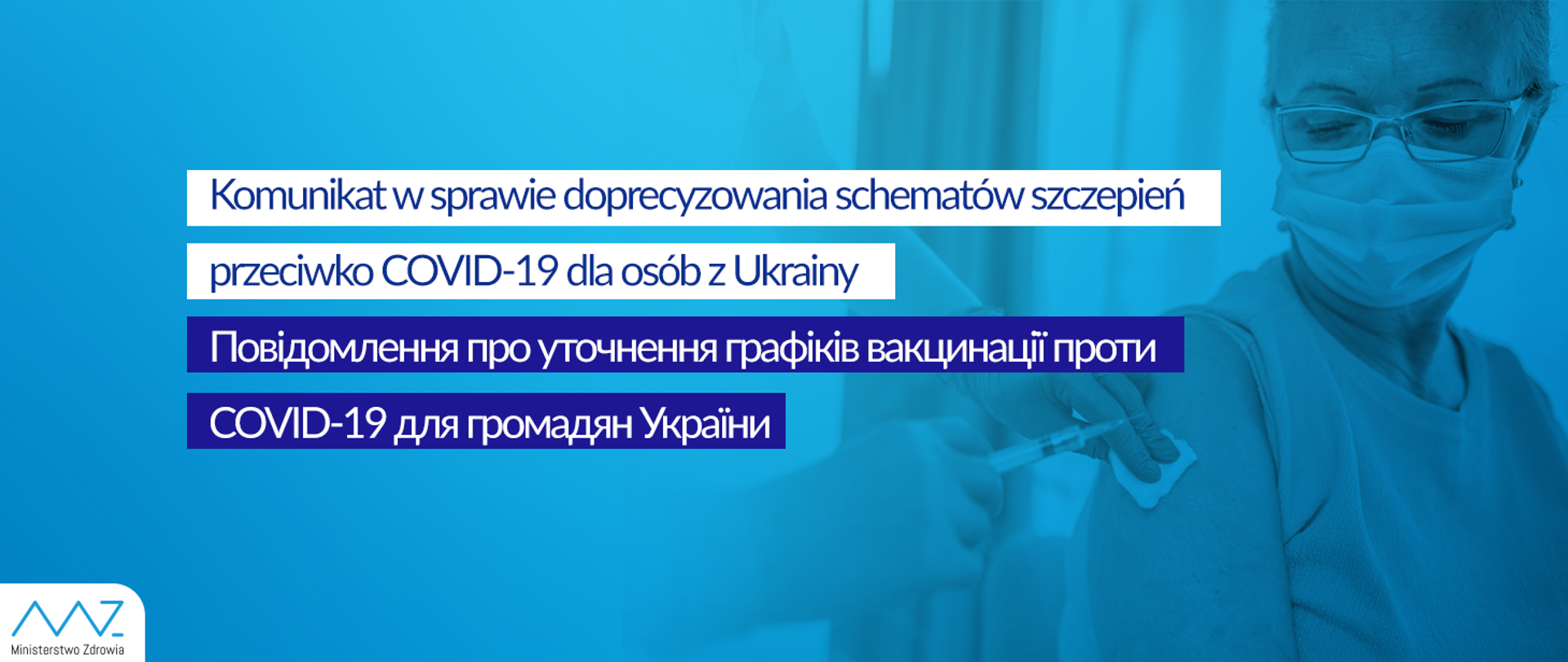 у зв'язку зі збройним конфліктом на території України, Міністерство здоров'я, маючи на увазі рекомендацію групи з імунізації від 7 березня ц. р. повідомляє, що вакцинація для людей з України повинна здійснюватися вакцинами, наявними в національній програмі вакцинації проти COVID-19, відповідно до показань і схеми поведінки, здійснюваної в Польщі.