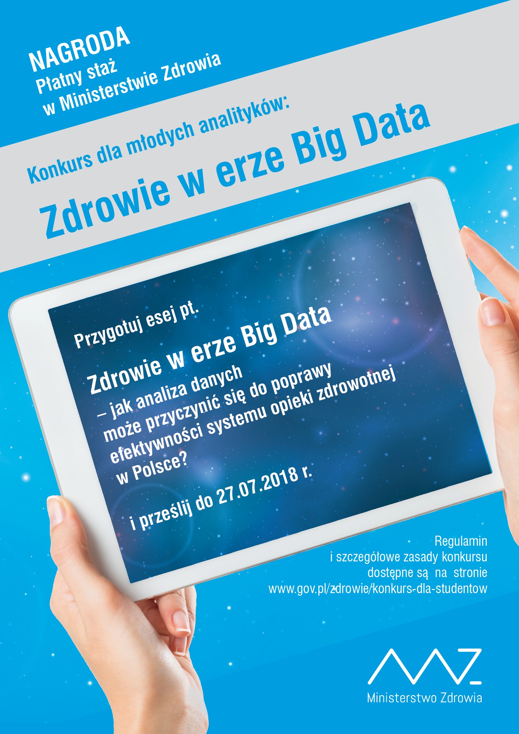 Aplikacje w formie CV oraz eseju konkursowego (maksymalnie 2 strony A4, czcionka 12 pt, interlinia 1.5 wiersza) na temat „Zdrowie w erze Big Data – jak analiza danych może przyczynić się do poprawy efektywności systemu opieki zdrowotnej w Polsce?” należy składać elektronicznie na adres: szkolenia@mz.gov.pl w terminie do 27.07.2018 r.
