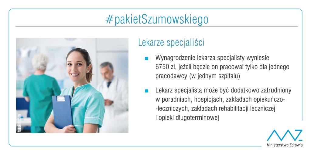 Wynagrodzenie lekarza specjalisty zatrudnionego na etacie będzie mogło wynieść 6750 zł pod warunkiem że będzie on pracował tylko u jednego pracodawcy, czyli w jednym szpitalu. Lekarz specjalista dodatkowo zatrudniony będzie mógł być m.in. w hospicjach, zakładach opiekuńczo-leczniczych i pielęgnacyjno-opiekuńczych oraz w zakładach rehabilitacji leczniczej i opieki długoterminowej.