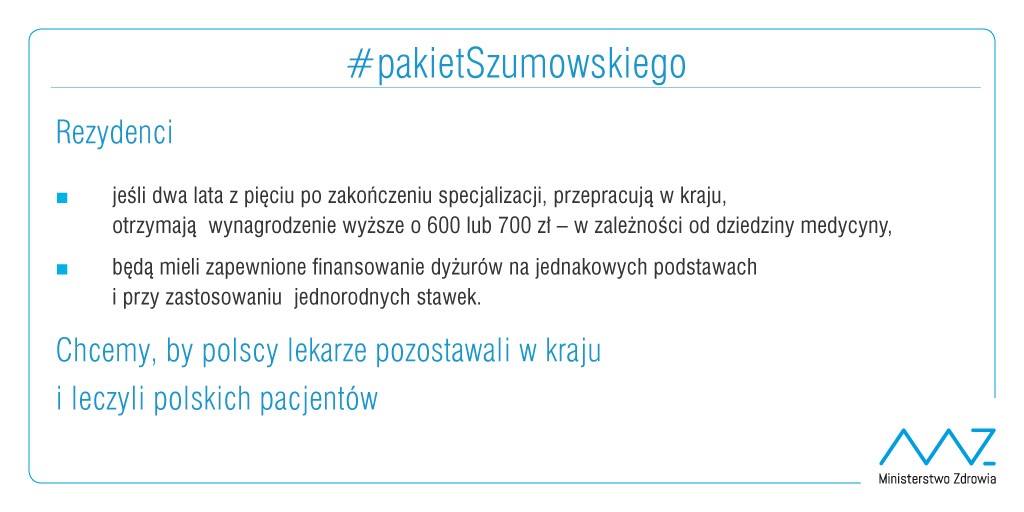 Lekarze odbywający szkolenie specjalizacyjne w ramach rezydentury w dziedzinie określanej jako nie priorytetowa będą mogli otrzymać wynagrodzenie większe o 600 zł miesięcznie, natomiast w dziedzinie określanej jako priorytetowa – o 700 zł miesięcznie. Aby otrzymać wyższe wynagrodzenie zasadnicze lekarz będzie musiał zobowiązać się do przepracowania – w podmiocie leczniczym finansowanym ze środków publicznych – łącznie 2 lat w ciągu kolejnych pięciu lat następujących po zakończeniu szkolenia specjalizacyjnego. Środki niezbędne do podniesienia wynagrodzenia zasadniczego będą przekazywane zakładowi zatrudniającemu lekarza na podstawie umowy zawartej z ministrem zdrowia.