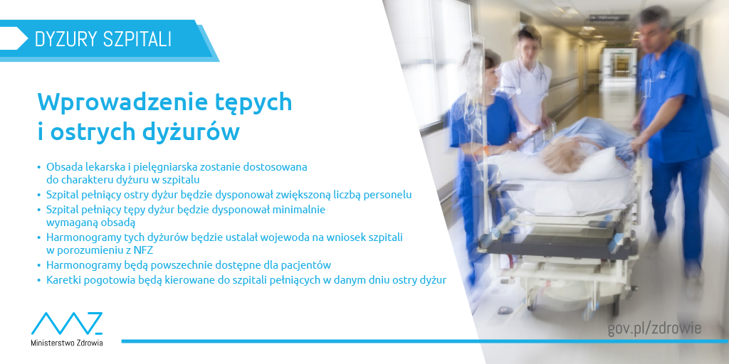 Kolejnym rozwiązaniem, które ma usprawnić działanie SOR-ów, będą tzw. ostre i tępe dyżury. W praktyce obsada lekarska i pielęgniarska zostanie dostosowana do charakteru dyżuru w szpitalu. Szpital pełniący dyżur ostry będzie miał zwiększoną liczbę personelu, natomiast podczas tzw. tępego dyżuru będzie dysponował tylko wymaganą przez przepisy obsadą. Dyspozytornie ratownictwa medycznego, posiadające informacje o obsadach, będą kierowały karetki do szpitali, w których funkcjonować będą dyżury ostre. Wprowadzenie zmian w zakresie dyżurowania będzie odbywać się na wniosek samych szpitali, a za koordynację i ustalanie harmonogramów będzie odpowiadać wojewoda w porozumieniu z dyrektorem Oddziału Wojewódzkiego NFZ. Informacje te będą także dostępne dla pacjentów w Biuletynie Informacji Publicznej.