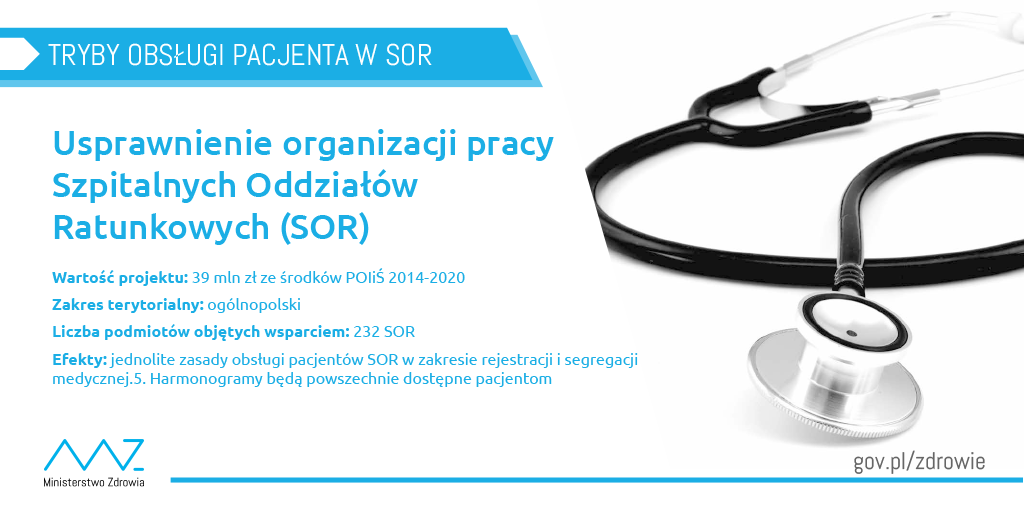 Wprowadzono jednolite zasady tzw. segregacji medycznej pacjentów w SOR-ach. Określanie stanu zagrożenia życia i zdrowia odbywać się będzie w oparciu o jednakowe, jasno sprecyzowane kryteria. Zwiększy to bezpieczeństwo pacjenta, a jednocześnie poprawi komfort pracy personelu medycznego. Dodatkowo utworzony zostanie system informatyczny usprawniający pracę Szpitalnych Oddziałów Ratunkowych (TOPSOR), który zapewni łatwy dostęp do informacji o przewidywanym czasie oczekiwania dla pacjenta, a także pozwoli na zapewnienie wyższej jakości danych dotyczących funkcjonowania SOR-ów bez obciążania personelu dodatkowymi obowiązkami sprawozdawczymi.