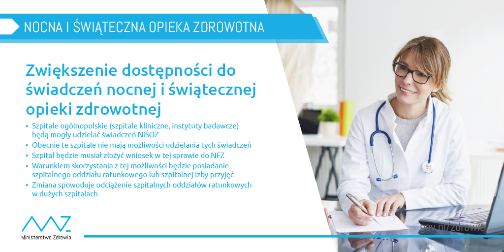 Ponadto zaproponowano zmiany w udzielaniu świadczeń nocnej i świątecznej opieki zdrowotnej (NiŚOZ). Po zmianach szpitale ogólnopolskie (np. szpitale kliniczne) będą mogły udzielać świadczeń NiŚOZ, jeśli mają szpitalną izbę przyjęć lub szpitalny oddział ratunkowy.