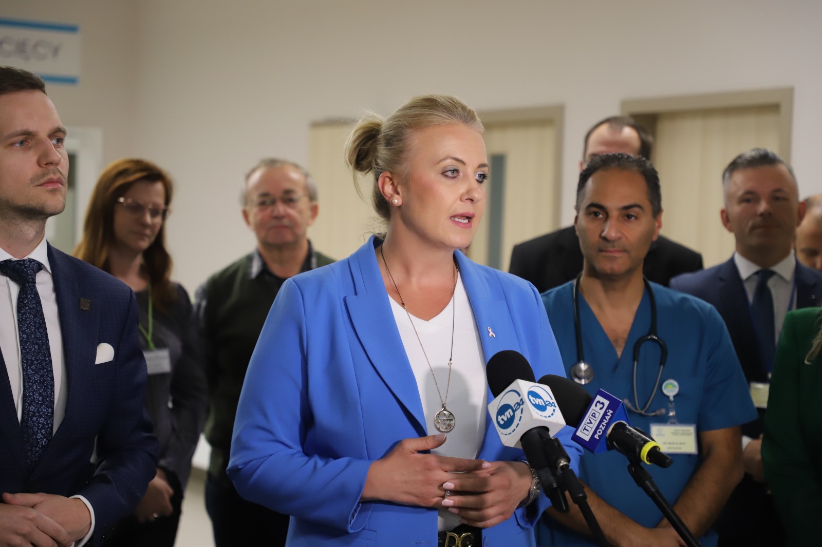 „Jesteśmy w szpitalu w Krotoszynie, w województwie wielkopolskim. Z tego województwa dotację dostanie 13 podmiotów na ponad 11 mln zł, a SPZOZ w Krotoszynie otrzyma 500 tys. zł” – wylicza minister zdrowia Katarzyna Sójka i dodaje: „Wprowadzenie innowacyjnych urządzeń robotycznych – egzoszkieletów oraz robotów rehabilitacyjnych jest dla wielu pacjentów szansą na powrót do zdrowia. Wykorzystanie robotów w rehabilitacji zwiększa jej skuteczność oraz umożliwia leczenie większej liczby pacjentów. Praca robota dopasowana jest do możliwości i etapów rehabilitacji pacjenta. Pozwala też na większą liczbę powtórzeń i intensywność rehabilitacji. Korzyści ze stosowania robota dotyczą nie tylko pacjentów, ale też fizjoterapeutów. Robot wspomaga ich i dzięki temu są w stanie pracować dłużej, bardziej efektywnie”.