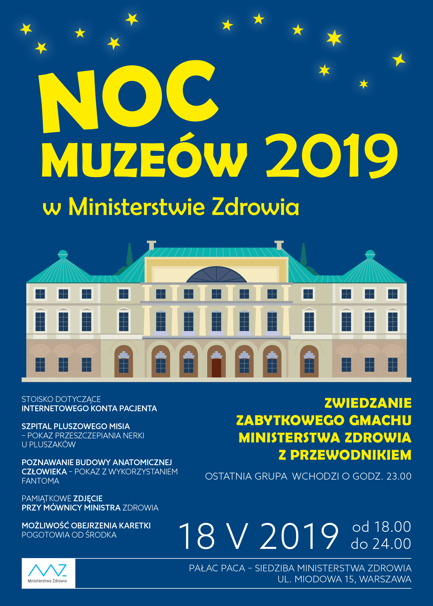 Czekamy na Państwa w siedzibie Ministerstwa Zdrowia przy ul. Miodowej 15. już od godziny 18.00 do 24.00. Każda grupa będzie zwiedzała zabytkowy gmach w towarzystwie zawodowego przewodnika, który opowie o ciekawostkach związanych z pałacem Paca i przybliży jego historię. Grupy będą wchodziły co 20 minut, a ostatnia z nich rozpocznie zwiedzanie o godz. 23.00.