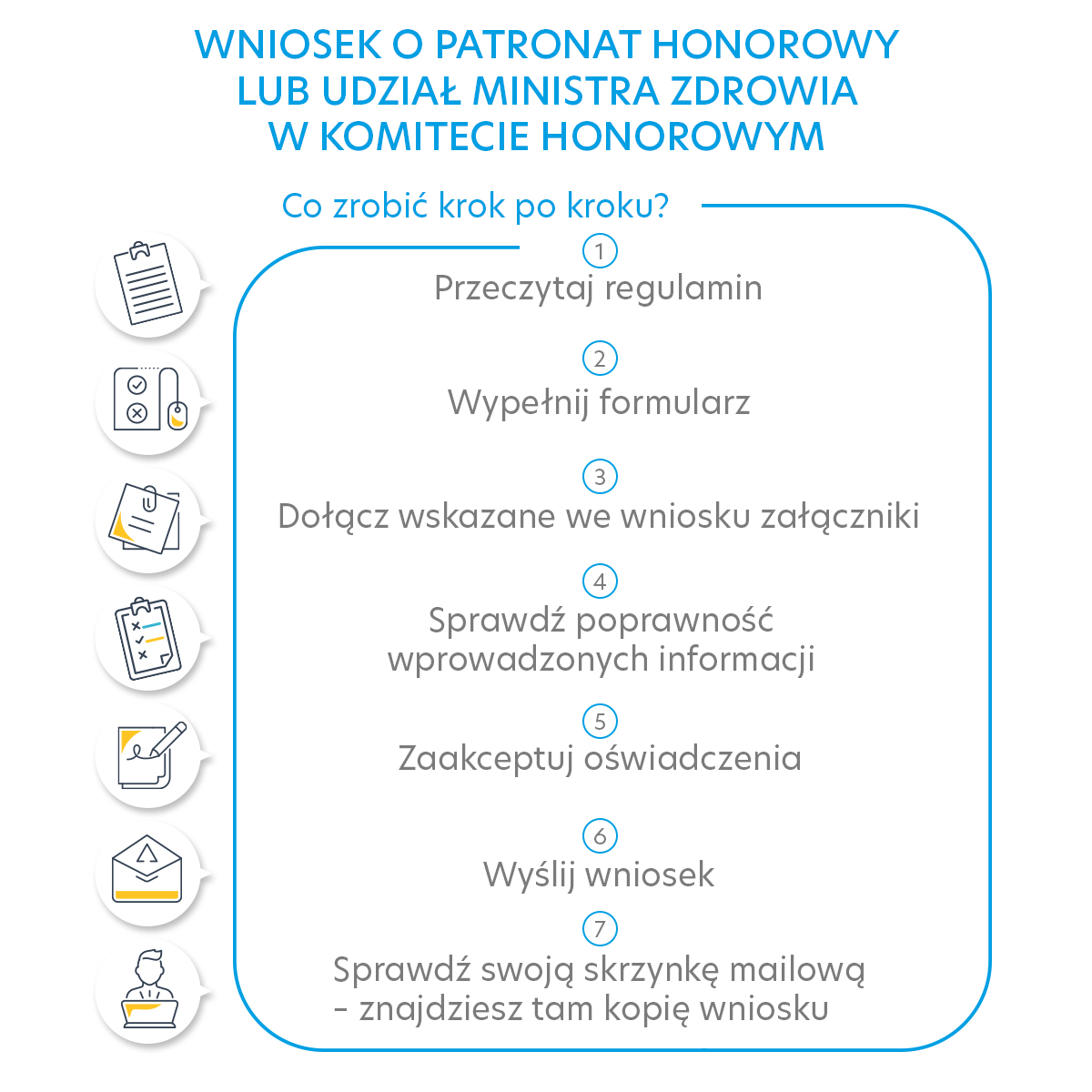 O objęcie honorowym patronatem lub udział Ministra Zdrowia w Komitecie Honorowym może starać się każdy, kto organizuje przedsięwzięcie służące promocji zdrowia. Aby przedsięwzięcie otrzymało patronat, powinno: