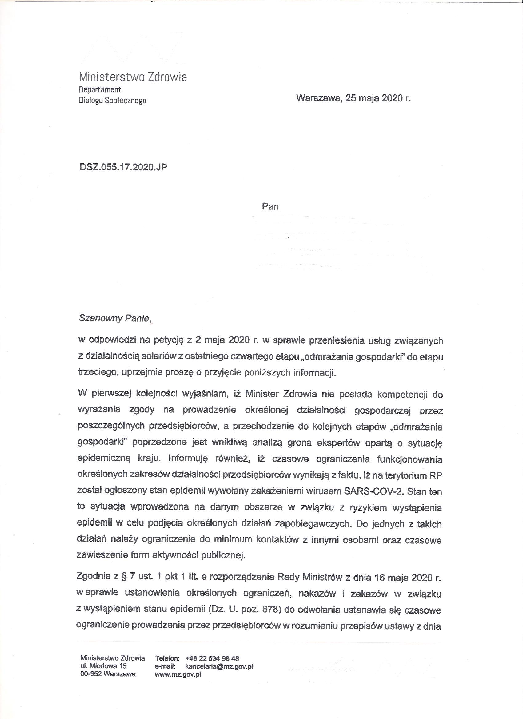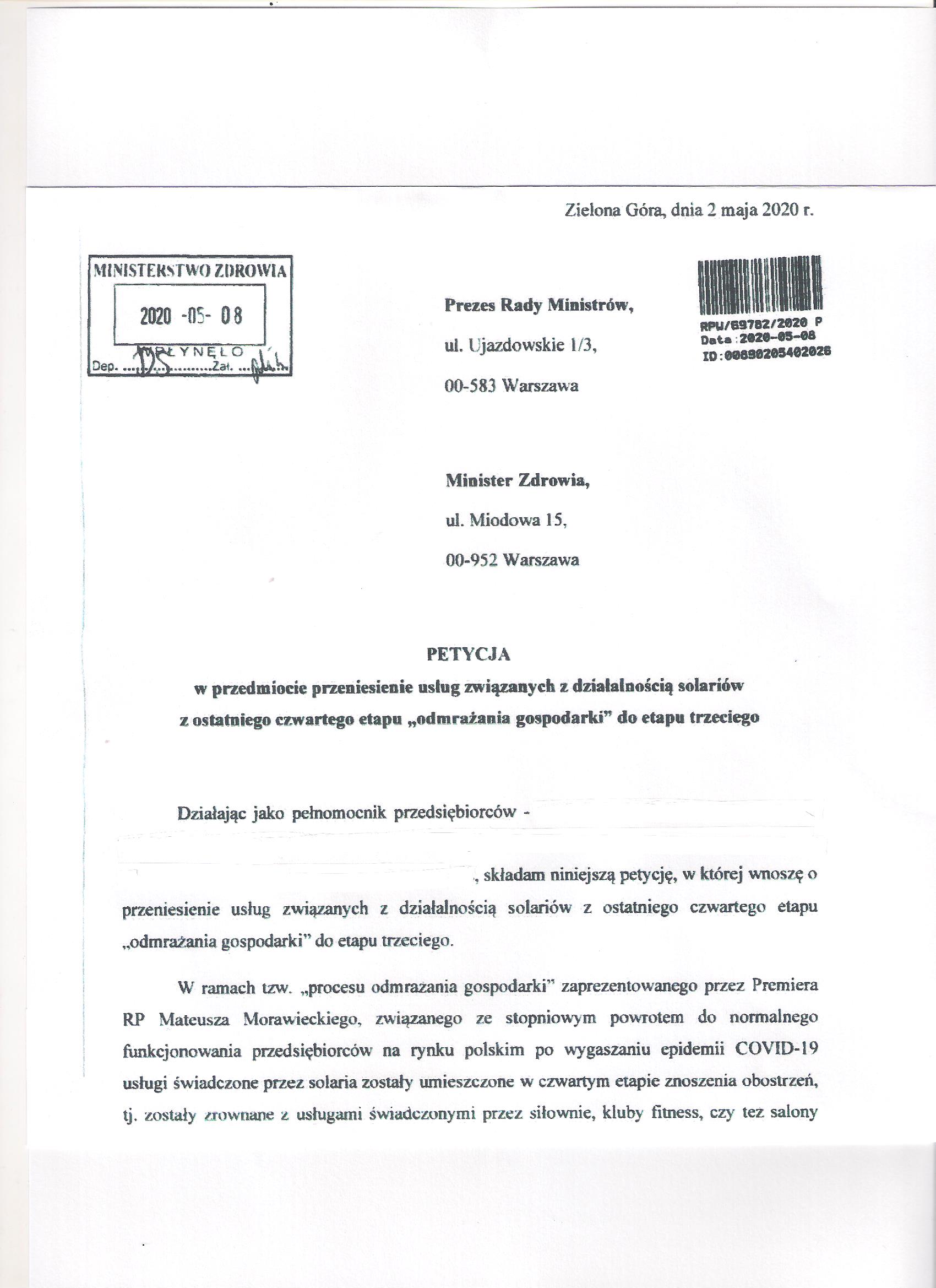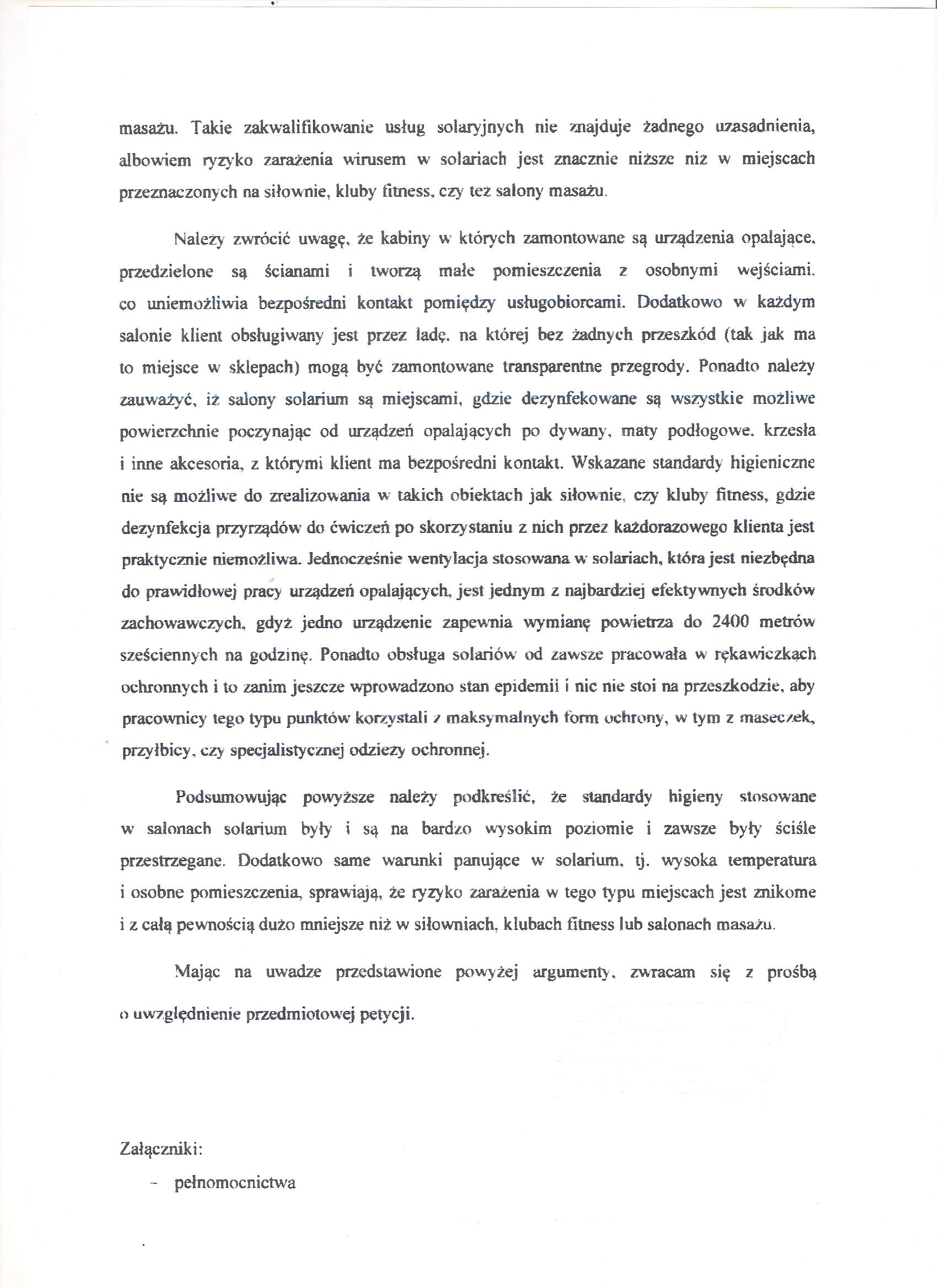Petycja ws. przeniesienia usług związanych z działalnością solariów z ostatniego czwartego etapu odmrażania gospodarki do etapu trzeciego