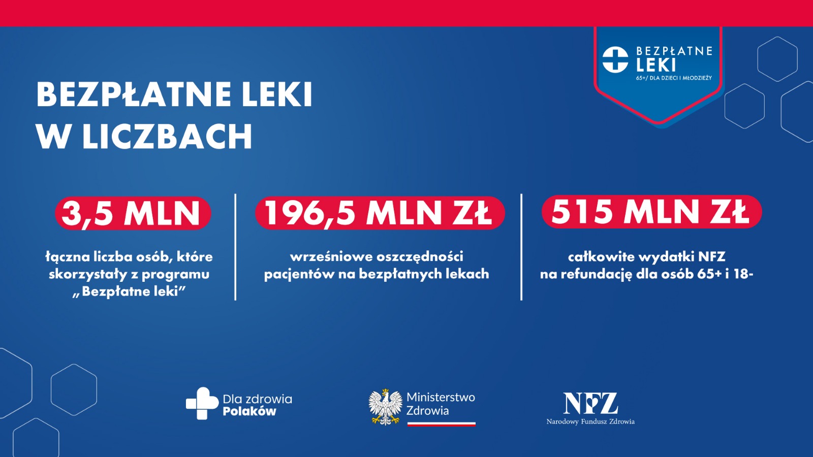 Minister zdrowia Katarzyna Sójka podkreśla, że to bardzo dobry program, który przynosi ogromne efekty. „We wrześniu z programu „Bezpłatne leki” skorzystało 2,8 mln nowych pacjentów. Do tej pory lekarze wypisali ponad 10 mln recept na bezpłatne leki. 200 mln zł to realna kwota, która została w portfelach uprawnionych pacjentów” – wylicza minister Sójka.