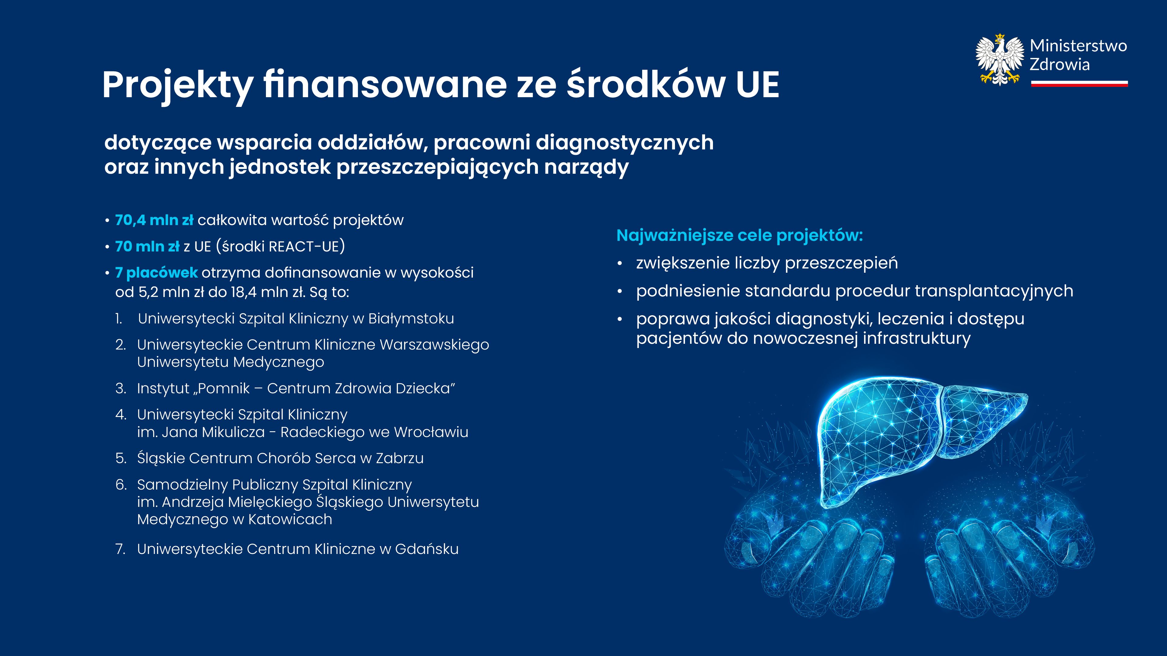 Wiceminister Zdrowia Marcin Martyniak dodał, że siedem placówek przeszczepiających narządy otrzyma w tym roku dofinansowanie z UE (środki REACT-UE), które będą przeznaczone na rozbudowę ośrodków, doposażenie i transport organów. - Polepszy się jakość świadczeń w zakresie transplantologii i komfort pacjenta, a także zwiększy się potencjał transplantacyjny. Wzajemne wspieranie się tych 7 ośrodków ma duże znaczenie w zakresie transportu, koordynacji leczenia i przyspieszenia realizacji procedur transplantacyjnych – wylicza wiceminister Martyniak.