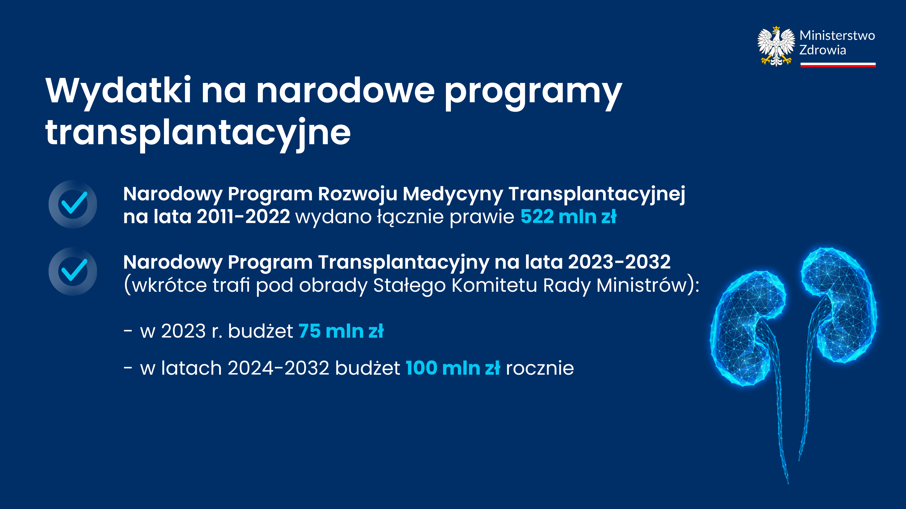 W najbliższych latach na transplantologię trafi 1 mld zł. Tylko w tym roku będzie to 100 mln zł. Powołujemy koordynatorów biorców organów i wyposażamy szpitale w sprzęt.