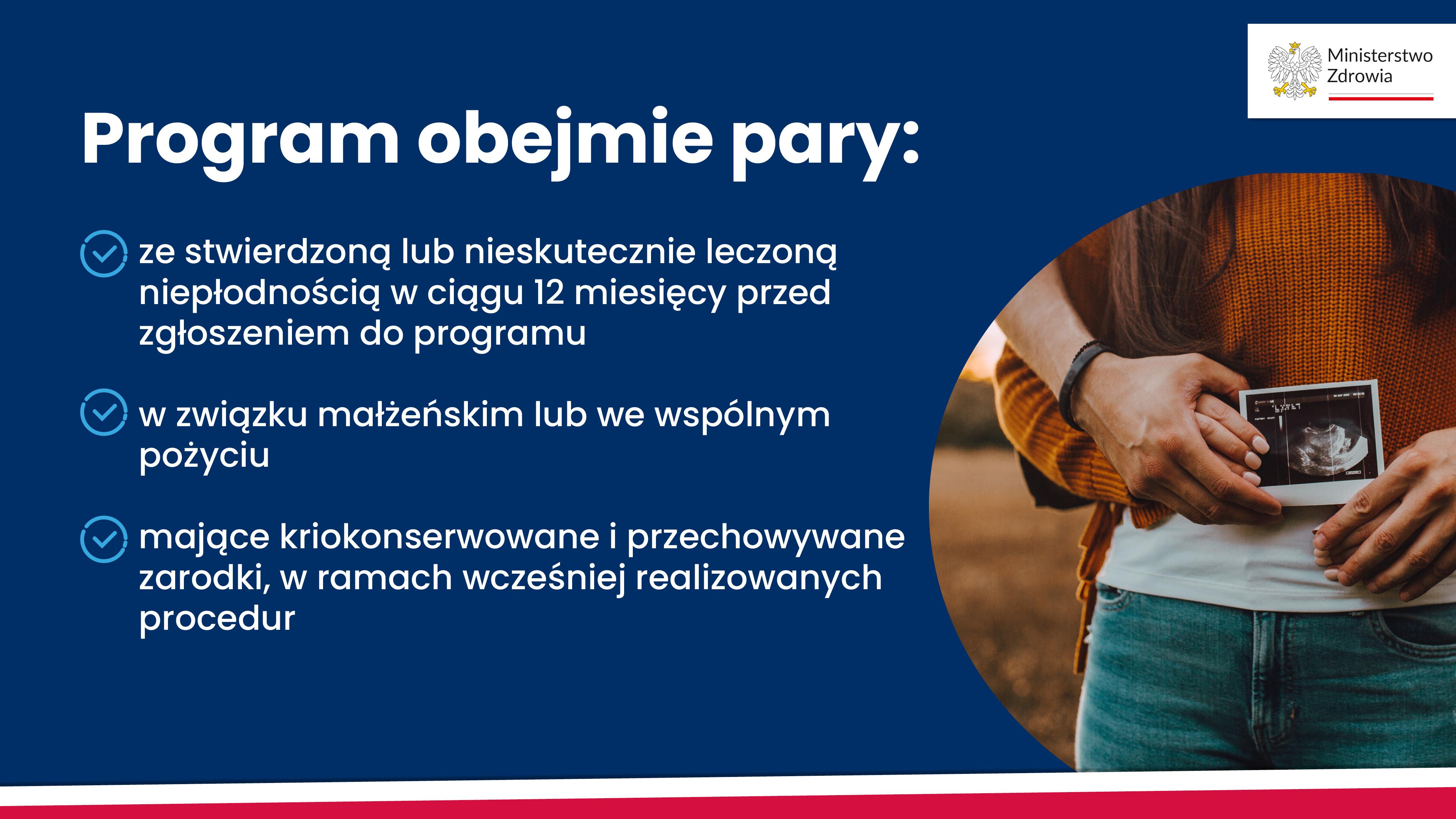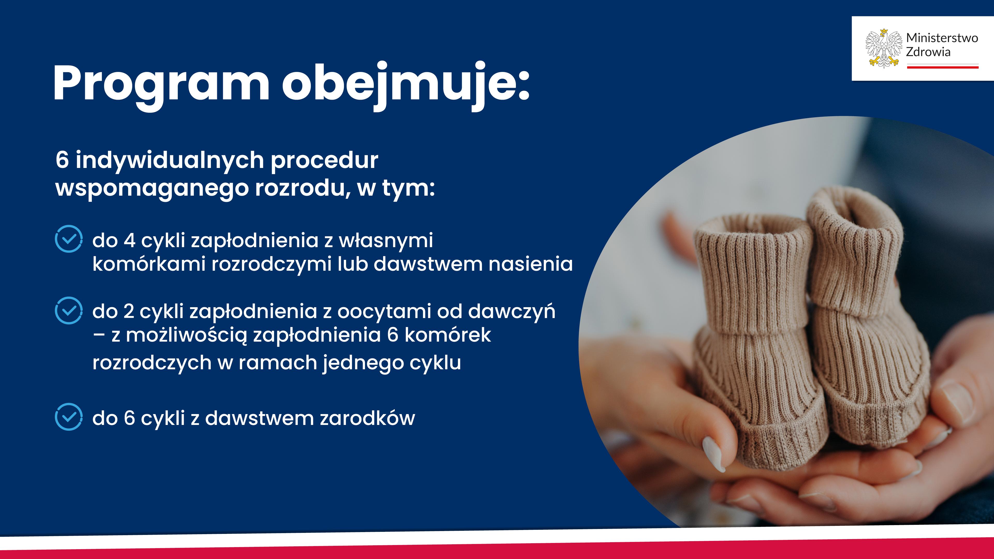 „Mamy to! Mamy program medycznego wsparcia zapłodnienia pozaustrojowego i leczenia niepłodności metodą in vitro. Jest to kolejny element projektu Świadoma, Bezpieczna Ja” – mówi minister zdrowia. I dodaje, że nad programem pracował zespół 14 wybitnych ekspertów z wielu dziedzin medycyny, m.in. w zakresie ginekologii, endokrynologii ginekologicznej i rozrodczości, perinatologii, medycyny rozrodczej i embriologii.